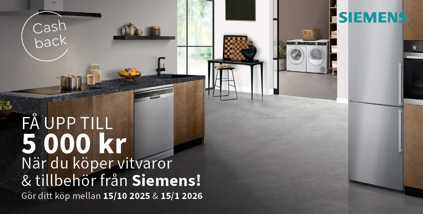 Just nu kan du ta del av Siemens cashback 2025 och få upp till 5000 kronor tillbaka när du köper och registrerar en ny vitvara eller ett tillbehör. Det är ett perfekt tillfälle att uppgradera ditt hem med Siemens moderna, energieffektiva produkter som kombinerar innovativ teknik och tidlös design.
