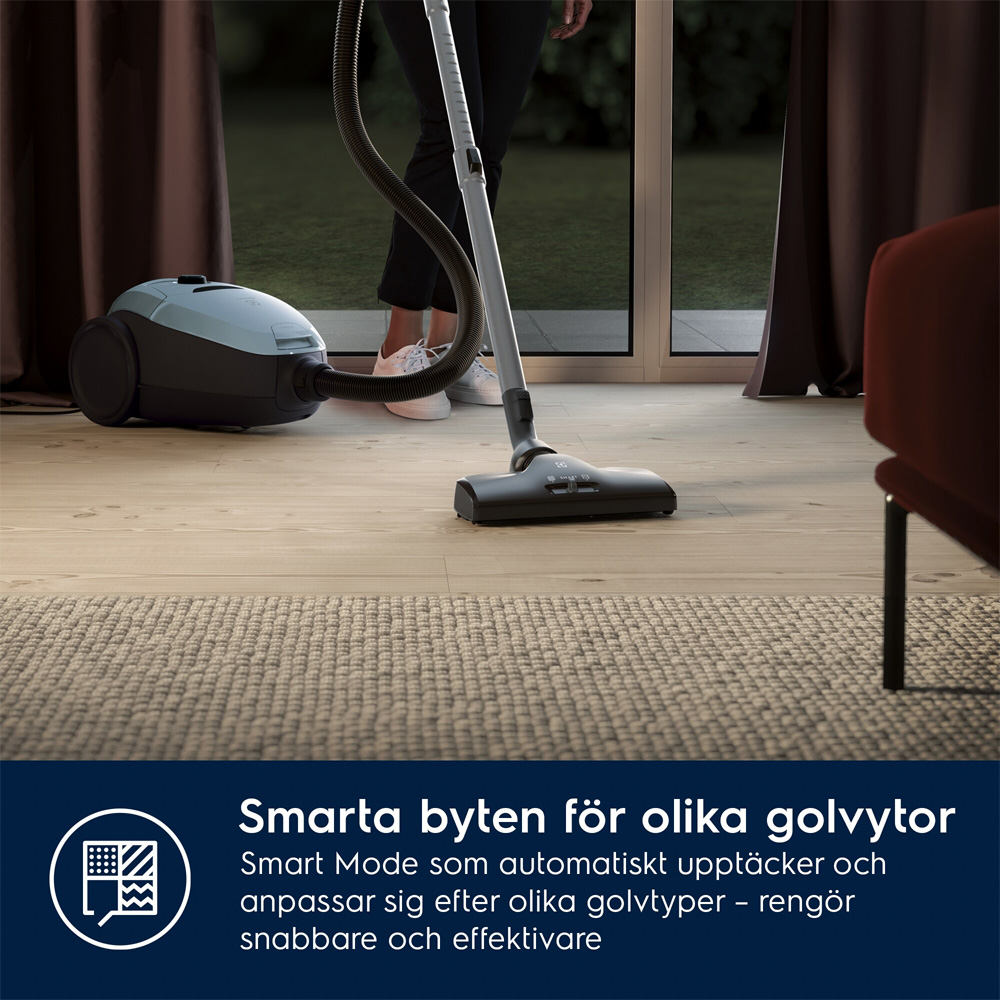 SmartMode-teknik ger automatiskt rätt sugkraft. Den avancerade SmartMode-tekniken känner av underlaget och anpassar sugeffekten när du går från golv till matta. Det gör städningen både enklare och mer effektiv, eftersom dammsugaren alltid arbetar med optimal kraft utan att du behöver justera själv.