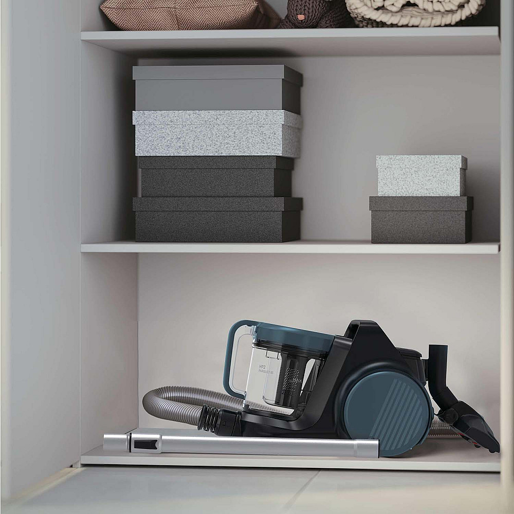Med låg ljudnivå (72 dB) och kompakt, lättviktig design kan du städa bekvämt i hela hemmet utan att störa andra. Den påslösa behållaren på 2,5 liter är lätt att tömma och rengöra, medan teleskopröret och 10 meters räckvidd gör städningen flexibel och enkel.