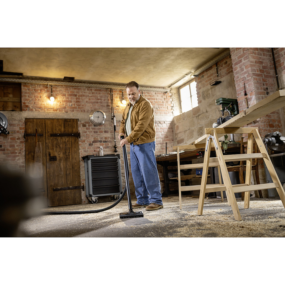 Anpassad för arbete med elverktyg. det integrerade eluttaget gör wd 5 control p till en idealisk partner för sladdade elverktyg, där damm och smuts sugs upp direkt när verktyget används för ett renare arbetsområde.