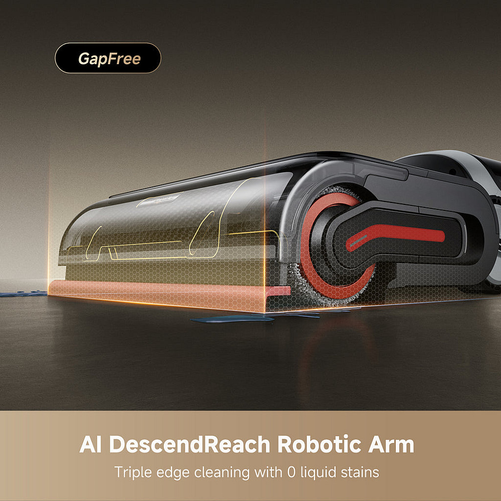 GapFree med AI DescendReach robotarm ser till att inget utrymme lämnas orört. Armen känner av och sänks automatiskt för att ta bort smuts längs väggar och golvlister vilket skapar en sömlös och heltäckande rengöring. Borsthuvudet med trippel kanttäckning gör rent även i hörn och längs kanter och lämnar golven utan vattenränder