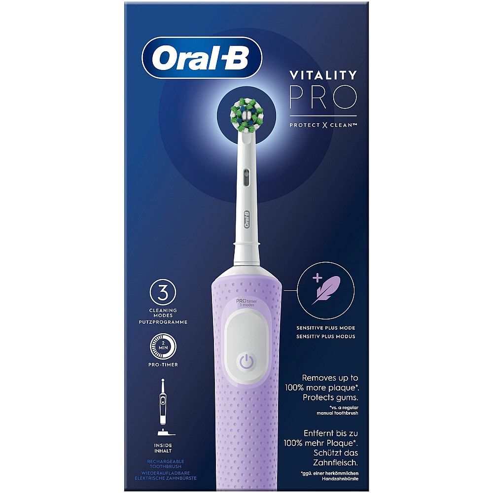 Skonsam prestanda Oral-B Vitality Pro erbjuder överlägsen rengöring jämfört med en manuell tandborste och är kliniskt bevisad att ge friskare tänder och tandkött. De tre borstlägena gör det enkelt att anpassa rengöringen efter dina behov.