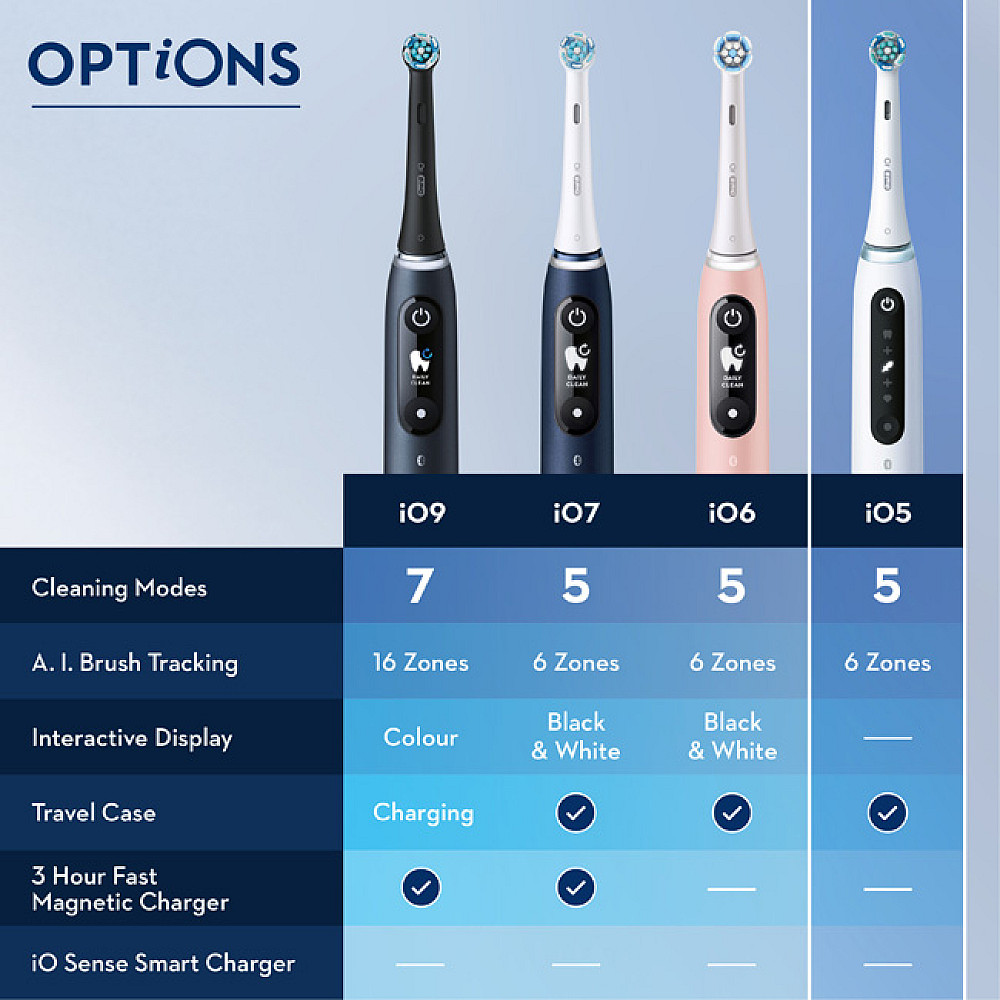 Innehåll: 1 iO5-handtag, 1 borsthuvud, 1 resefodral, 1 laddare, 1 hållare för borsthuvud