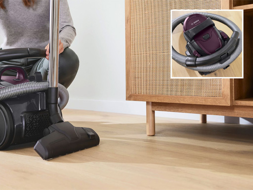 Att förvara dammsugaren har aldrig varit enklare. Tack vare den kompakta slangförvaringen kan slangen fästas direkt på enheten, vilket sparar plats och gör den enkel att ställa undan. Perfekt för mindre utrymmen som skåp eller garderober.