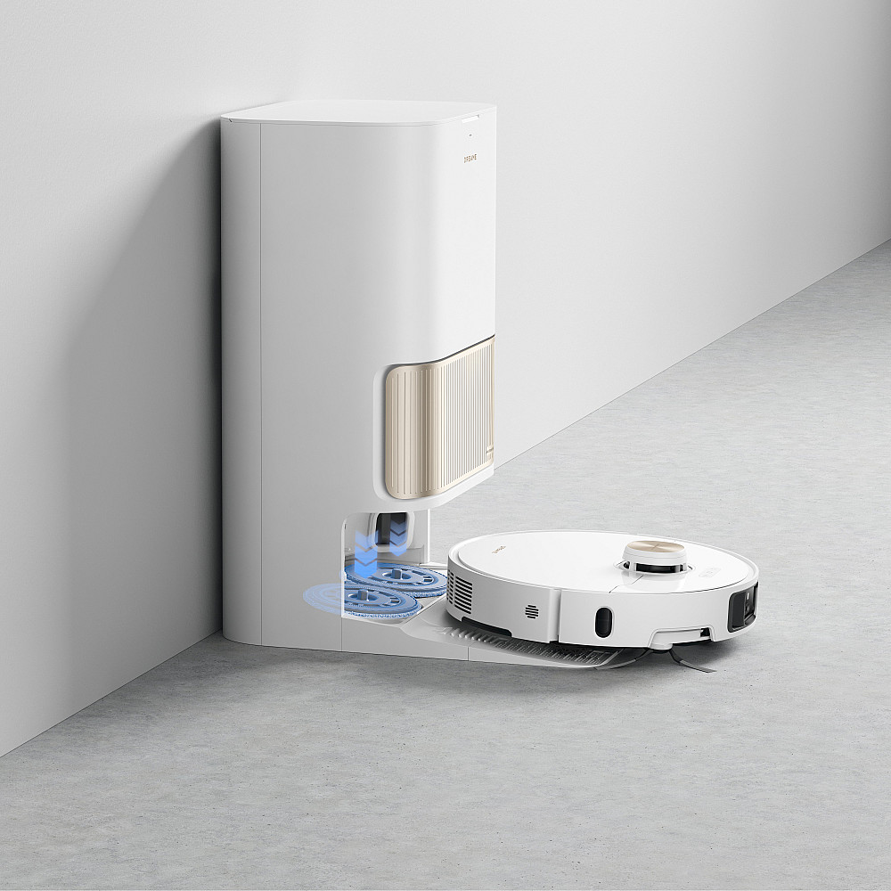 Basstationen hanterar allt underhåll automatiskt. Den tömmer dammbehållaren, tvättar moppar och tvättbräda med 65 grader varmt vatten, fyller på vatten och rengöringsmedel och torkar mopparna med varm luft. Systemet håller sig rent och fräscht i upp till 75 dagar utan manuell insats.