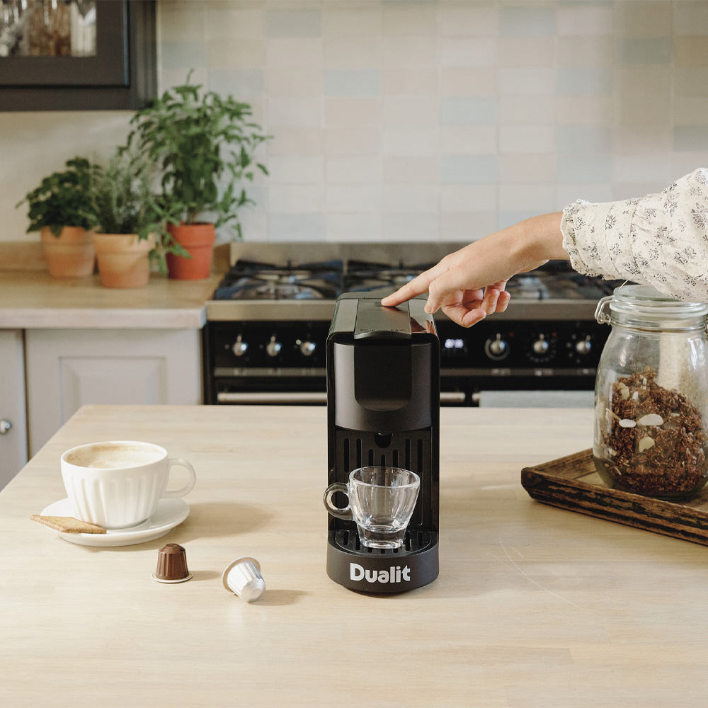 Podmaskinen från Dualit är den perfekta genvägen till riktigt gott kaffe snabbt, enkelt och utan krångel. Den smarta, kompakta designen gör den idealisk för mindre kök och ger dig en fulländad kopp kaffe på kort tid.