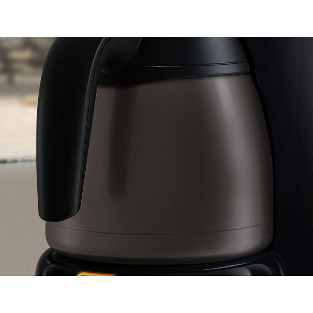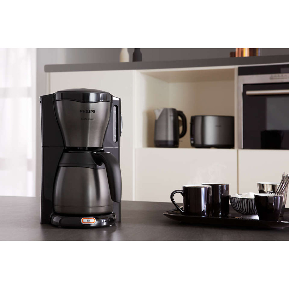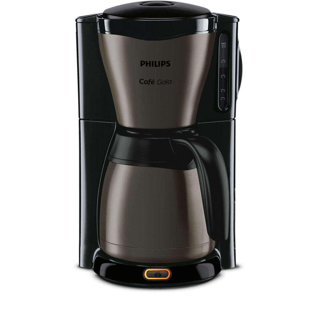 Utsökt och varmt kaffe, med snygg design Café Gaia-kaffemaskinen erbjuder kvalitet på både kaffe och i utformning. Termoskannan bibehåller full arom och temperatur i minst 2 timmar. Titandesignen gör den till en förstklassig och elegant kaffemaskin.