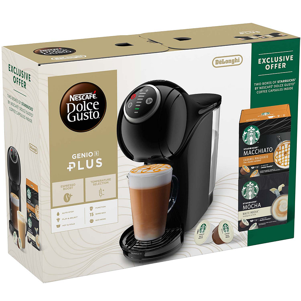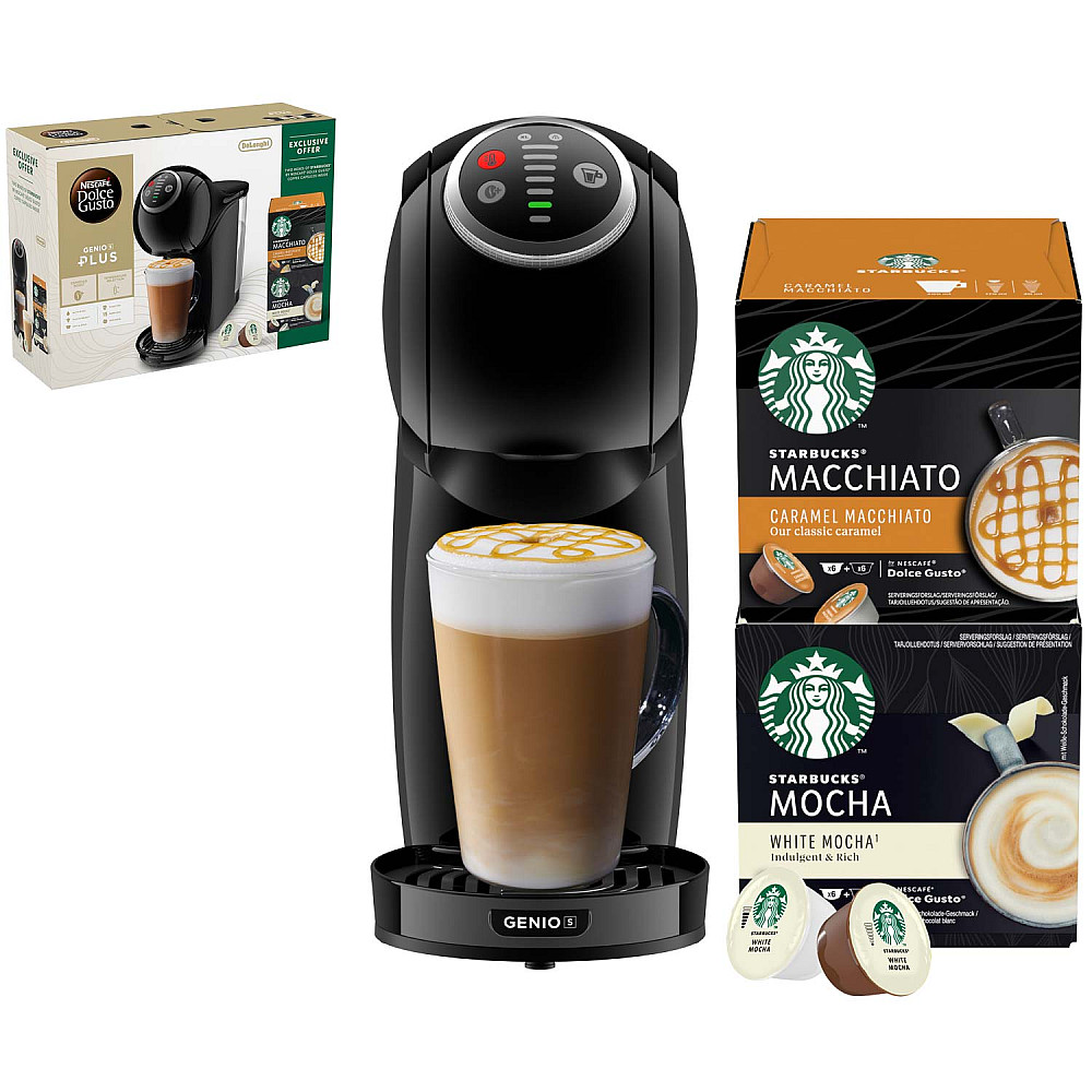 Upplev cafékvalitet hemma med denna exklusiva STARBUCKS bundle som innehåller NESCAFÉ Dolce Gusto Genio S Plus kapselmaskin och två STARBUCKS-favoriter - Caramel Macchiato och White Mocha.