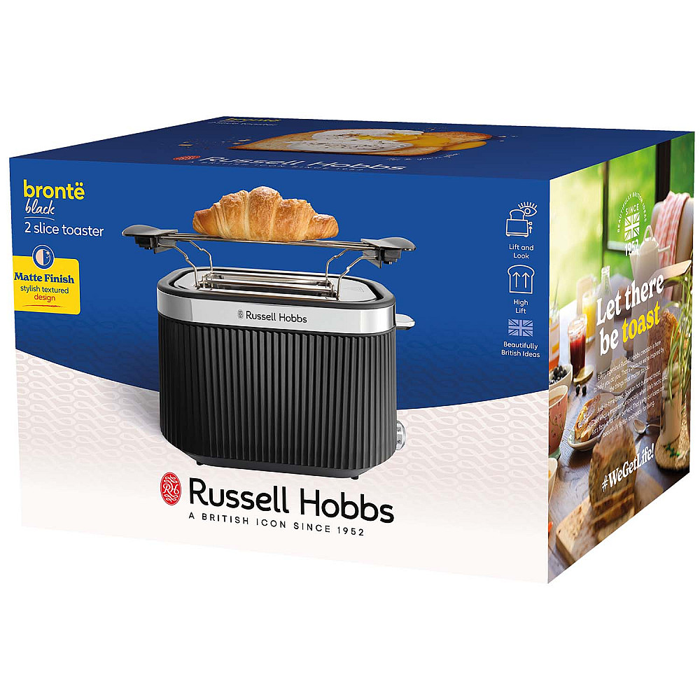 Russell Hobbs Brontë tvåskivstoaster kombinerar en matt svart räfflad design med eleganta detaljer i rostfritt stål och skapar en brödrost som verkligen sticker ut på köksbänken. Den är både elegant och funktionell och passar lika bra i moderna som klassiska kök. Med Lift and Look funktionen kan du titta till rosten utan att stoppa processen och den höga lyftfunktionen gör att du enkelt får upp även små bröd utan att bränna fingrarna.