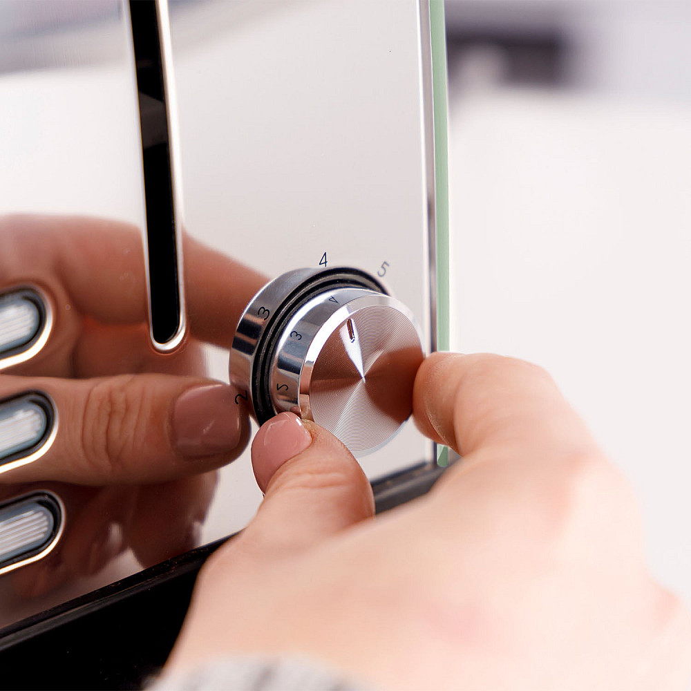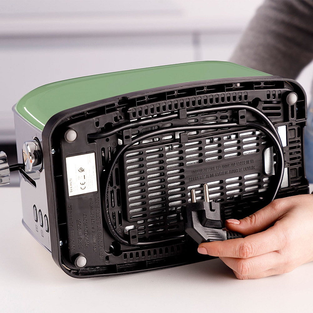 Stilfull konstruktion i rostfritt stål med olive-finish gör brödrosten till ett genomtänkt val för dig som vill förena estetik och funktion i vardagens frukostar.