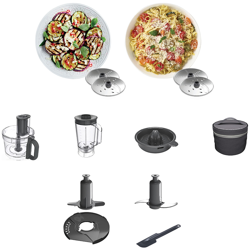 - Tillbehör: Matberedare, mixer, 2 & 4 mm skivningsskiva, 2 & 4 mm rivskiva, degkrok, mikrotandade knivblad, vispredskap