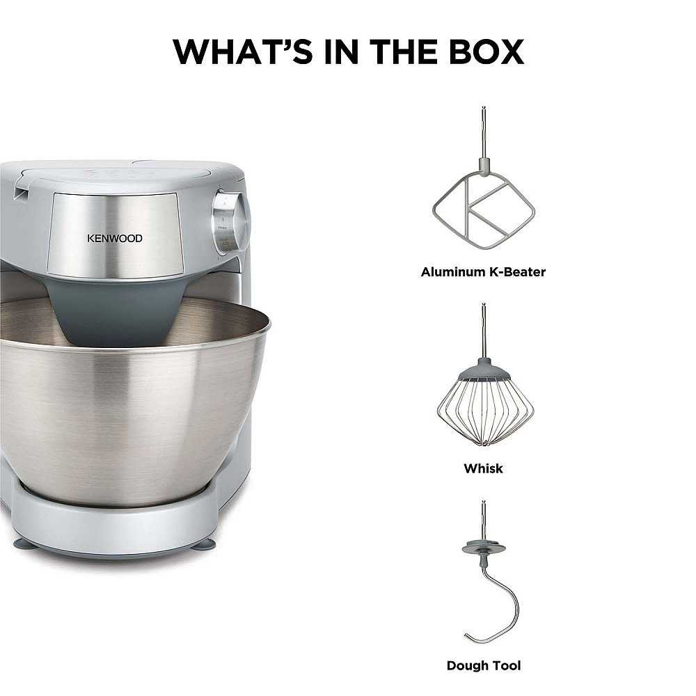 Prospero+ levereras med tre robusta verktyg K-spade, ballongvisp och degkrok som gör den idealisk för allt från smet och kakor till bröd och pizzadeg. Det medföljande stänkskyddet håller bänken ren och minskar spill under arbetet. Maskinen kan dessutom kompletteras med flera tillbehör från Kenwood, vilket gör att den växer med dina behov.
