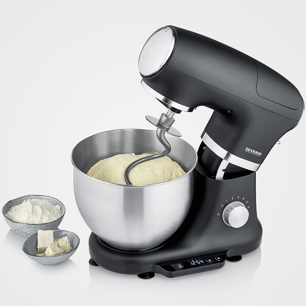 Denna köksassistent kombinerar styrka, stil och smarta funktioner i ett och samma paket. Med sin eleganta design i mattsvart färg och en rymlig skål på 5,5 liter klarar den av att hantera både små och stora bakprojekt. Maskinen kan knåda upp till 3 kilo kakdeg eller 1,5 kilo jästdeg - perfekt för dig som gillar att baka mycket på en gång.