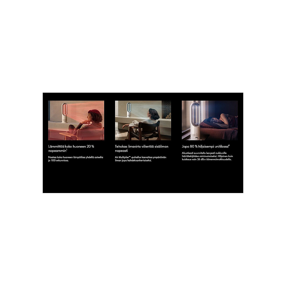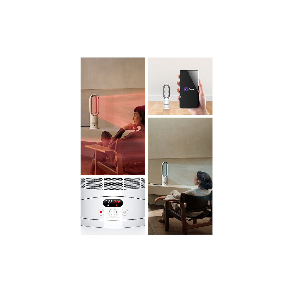 Snabb och jämn uppvärmning av hela rummet. Med keramiska värmeplattor och Dyson Air Multiplier teknik sprids värmen jämnt i rummet utan att skapa kalla zoner. Enheten kan höja rumstemperaturen märkbart på mycket kort tid och är konstruerad för att värma hela rummet istället för att skapa lokal värme nära apparaten.