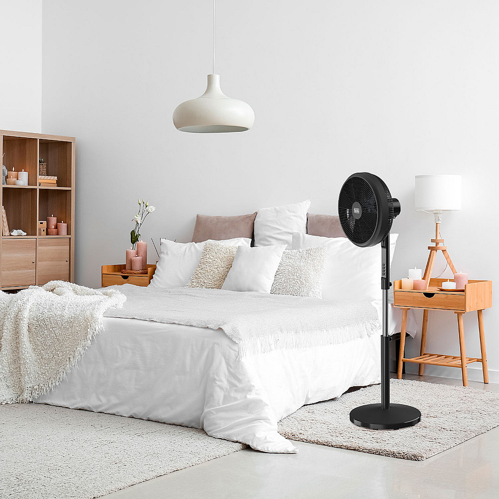Flexibel placering. Den justerbara höjden gör fläkten lätt att anpassa till olika möbleringar och rum. Den svarta designen ger ett stilrent och modernt intryck.