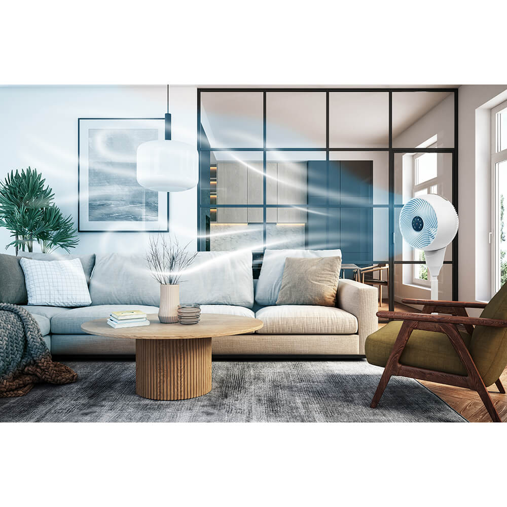 Jämn och behaglig luftfördelning. Fläkthuvudet rör sig både i sid? och höjdled för att sprida luften i flera riktningar. Genom att luften cirkulerar via väggar och tak uppstår en mjuk bris som kyler hela rummet istället för att blåsa direkt mot användaren.
