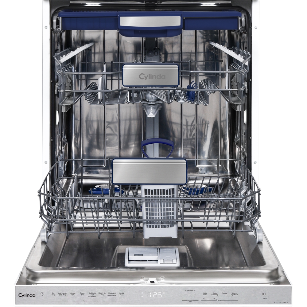 Maskinen är utrustad med toppkorg, höj- och sänkbar överkorg samt en extra bestickkorg i den undre korgen för bättre flexibilitet. Friktionsfria skenor gör att överkorgen glider mjukt och tyst.