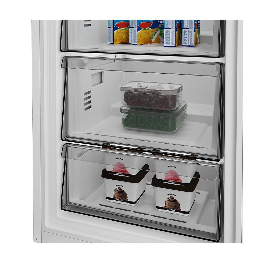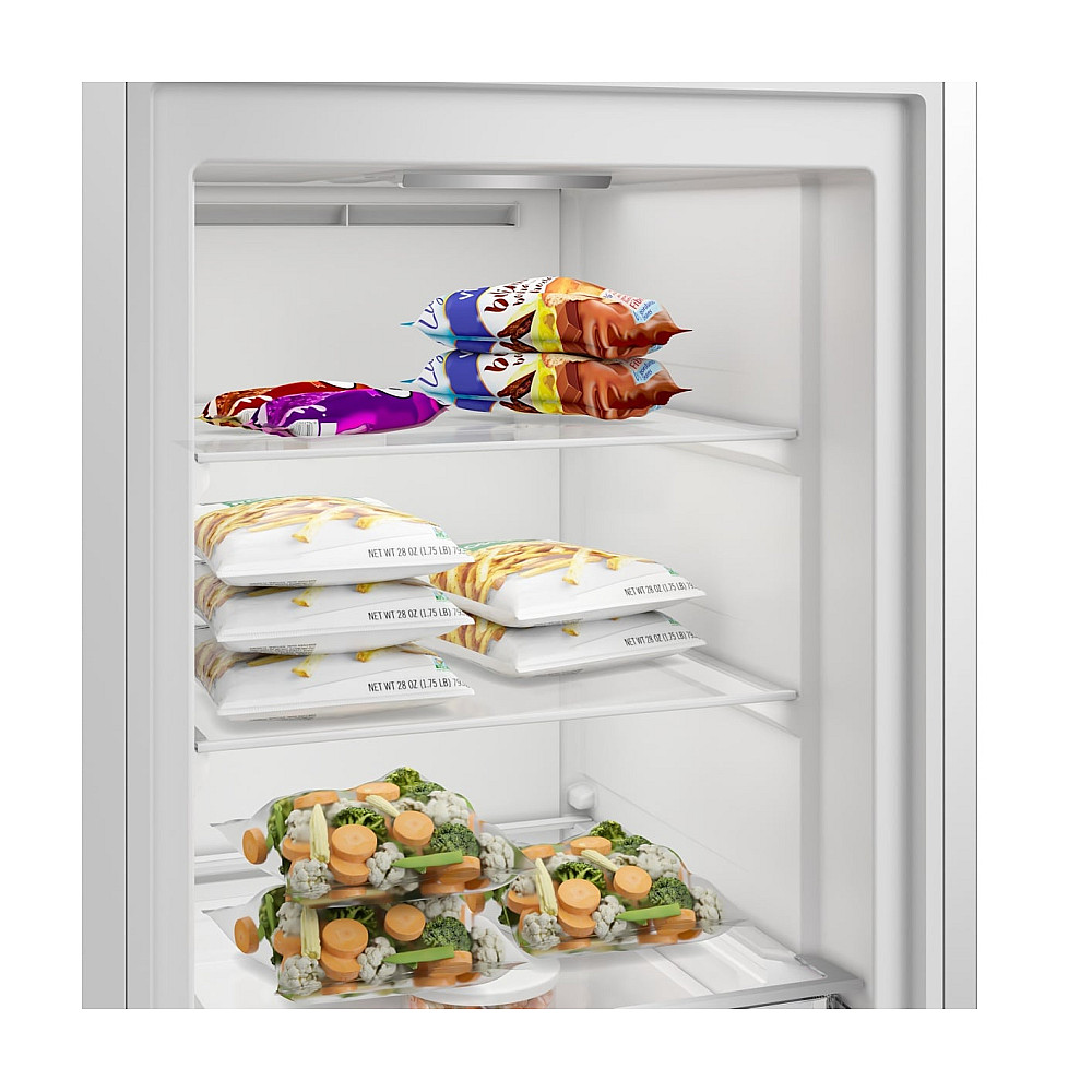 Avancerad teknik för enkel vardag: NoFrost tekniken säkerställer att frysen förblir helt fri från isbildning, vilket eliminerar behovet av manuell avfrostning. Systemet bibehåller en jämn temperatur och stabil luftcirkulation i hela skåpet. Med Quick Freeze funktionen sänks temperaturen snabbt när nya varor läggs in, vilket hjälper till att bevara råvarornas kvalitet, smak och konsistens. Frysen klarar infrysning av sjutton kilo per dygn, vilket gör den perfekt vid större inköp.