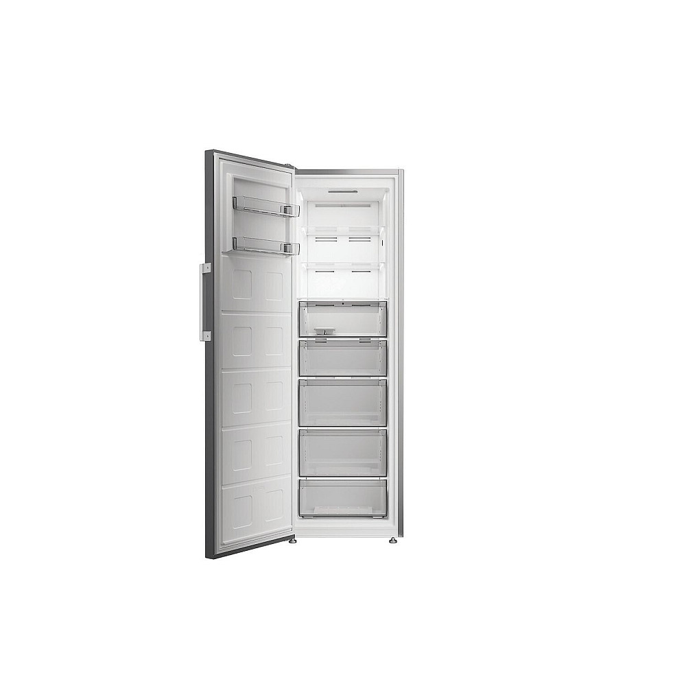 Stilren design och praktiska funktioner: Den moderna titan inox ytan tillsammans med det tåliga metallhandtaget ger frysen ett exklusivt uttryck som passar in i många hem. Displayen på dörren gör det enkelt att justera temperatur och funktioner, medan LED belysningen ger ett klart ljus och god översikt över hela skåpet. Modellen kombinerar design och funktion på ett sätt som gör vardagen både enklare och mer stilfull.