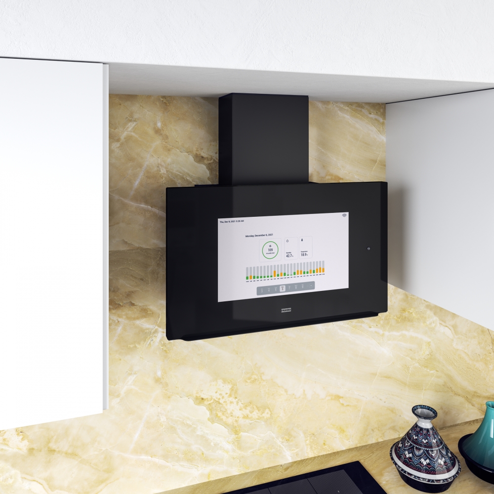 Stilren design för moderna kök. Franke AQ Sense Flat i svart glas är en vägghängd spisfläkt som kombinerar modern design med effektiv ventilation. Den slimmade formen gör fläkten till ett elegant inslag i köket samtidigt som den ger gott om utrymme över spishällen.