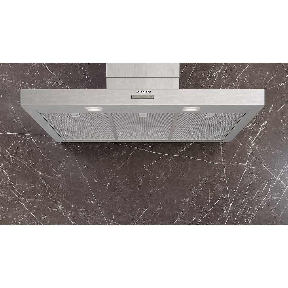 Modern design i inox-look. Siemens LC93BBC30 iQ100 är en vägghängd köksfläkt med stilren boxDesign som passar fint i moderna kök. Den ger ett elegant uttryck och blir en naturlig del av köksinredningen.