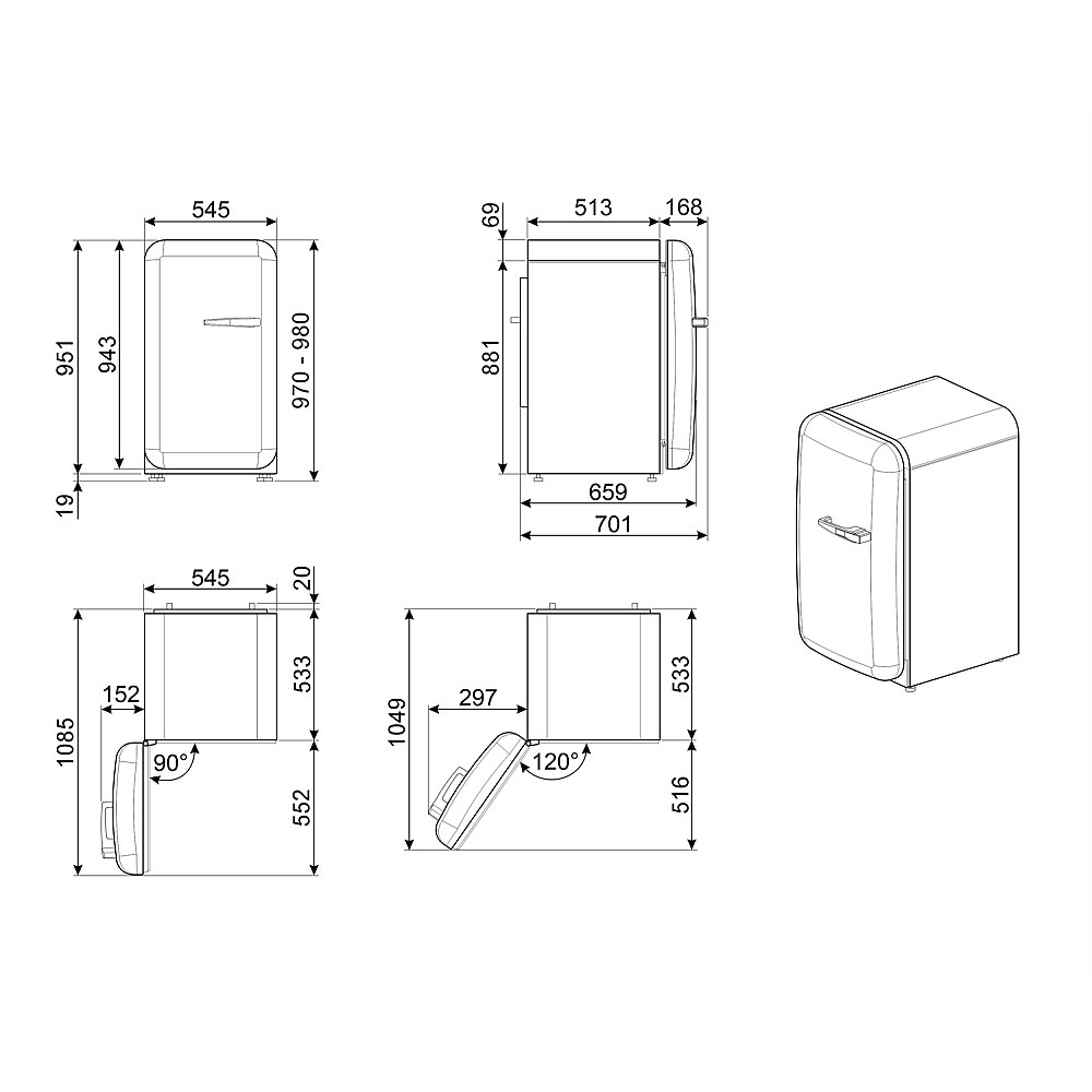 En kompakt designikon i vit högglans. Smeg White minibar kombinerar klassisk 50 tals estetik med smart funktion i ett smidigt format. De rundade formerna, den blanka vita finishen och det kromade handtaget gör modellen till ett stilfullt inslag i kök, vardagsrum, kontor eller hotellrum.