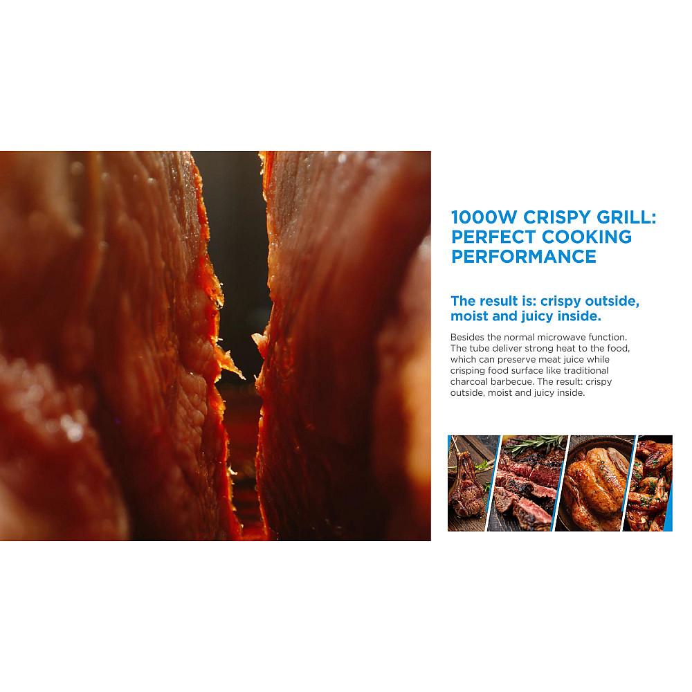 Modellen erbjuder fem effektinställningar och har en mikrovågseffekt på 700 W. Den kompletteras med en grillfunktion på 1000 W som ger möjlighet att tillaga mat med både färg och struktur. Detta gör mikron lämplig för användning där värmning, grillning och enklare matlagning kombineras.