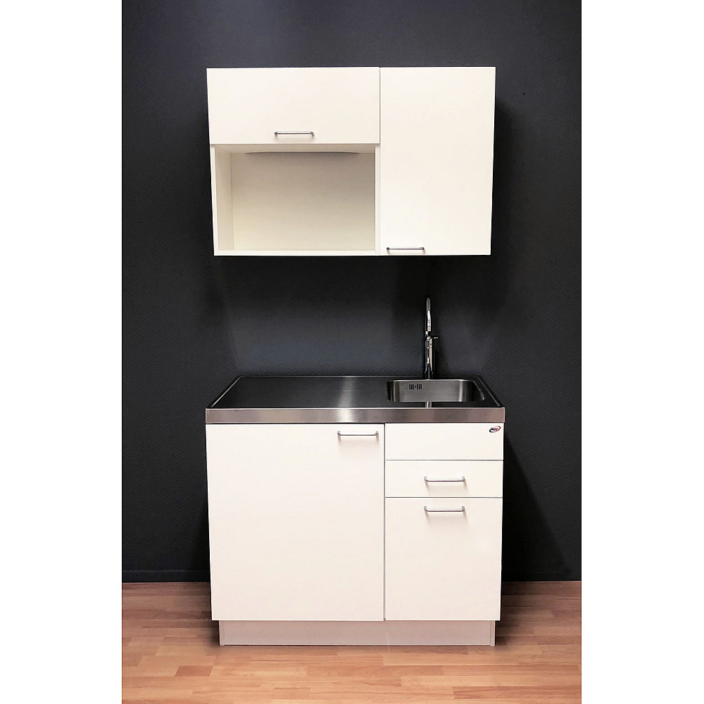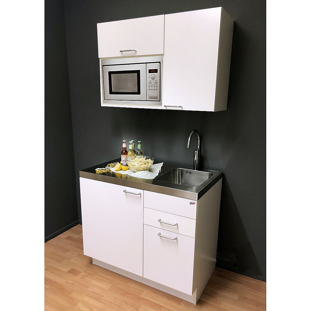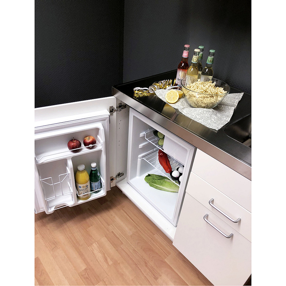 Den rostfria diskbänken är utrustad med en diskho och finns i både höger- och vänsterutförande för att passa olika köksplaneringar. Kylskåpet under bänken har ett praktiskt köldfack för förvaring av enklare frysta varor.