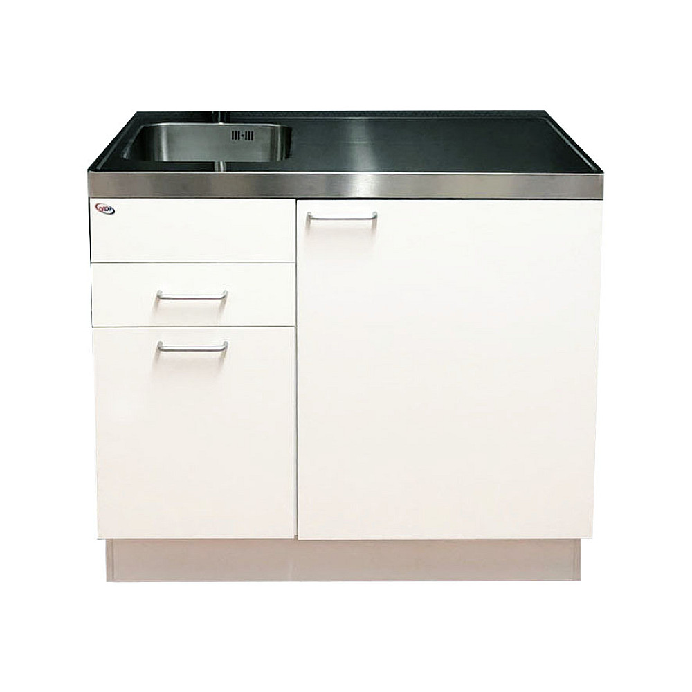 Den rostfria diskbänken är utrustad med en diskho och finns i både höger- och vänsterutförande för att passa olika köksplaneringar. Kylskåpet under bänken har ett praktiskt köldfack för förvaring av enklare frysta varor.