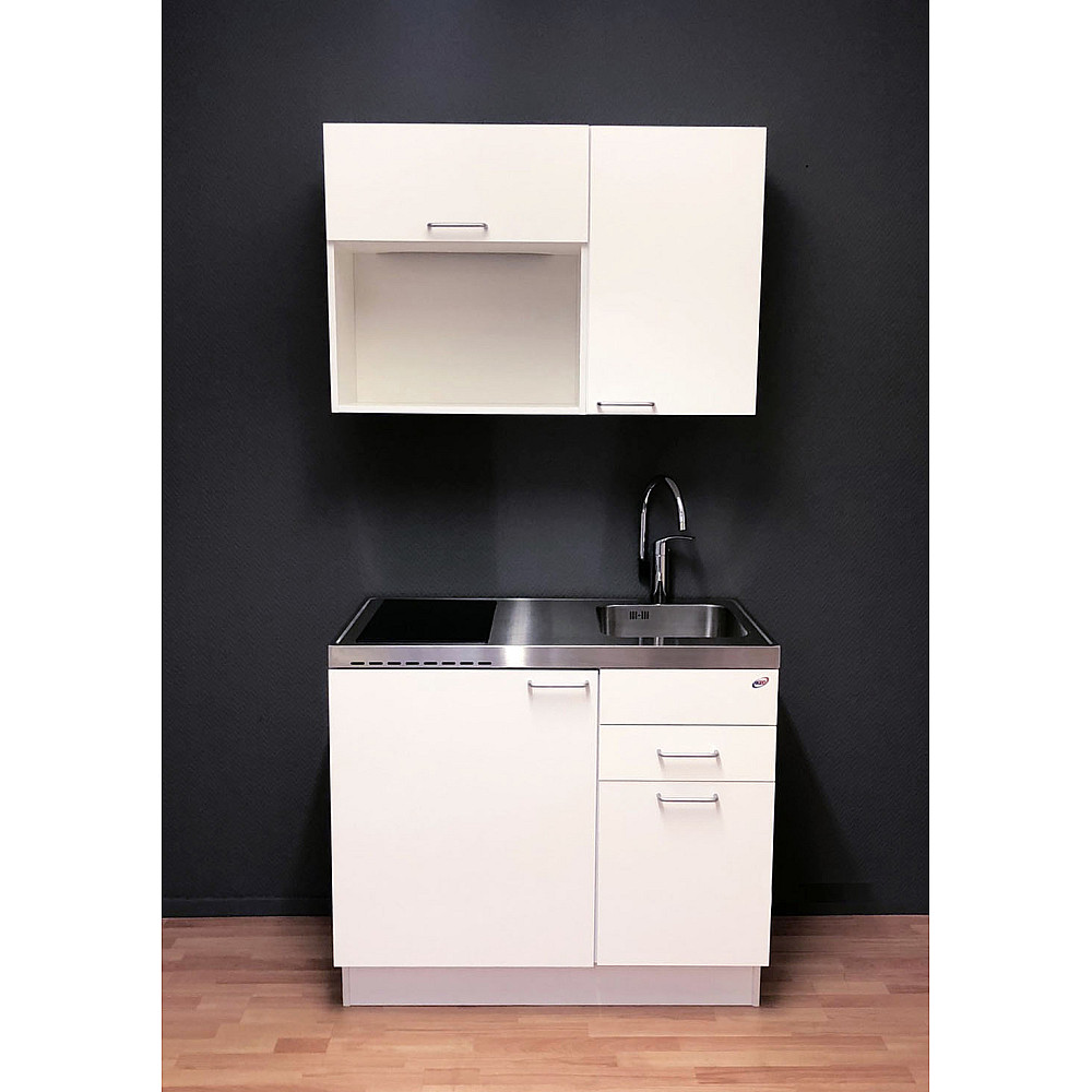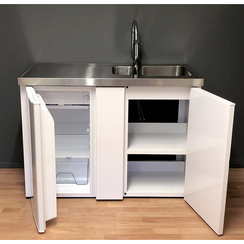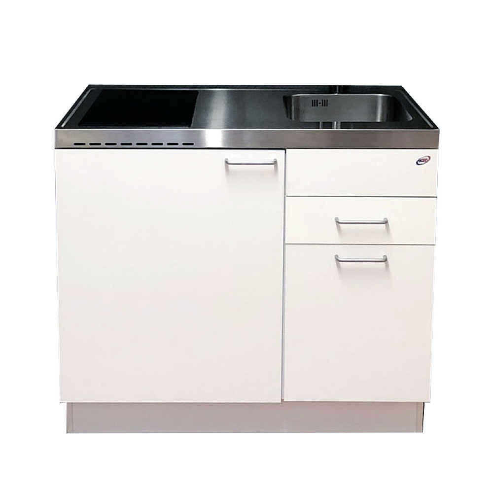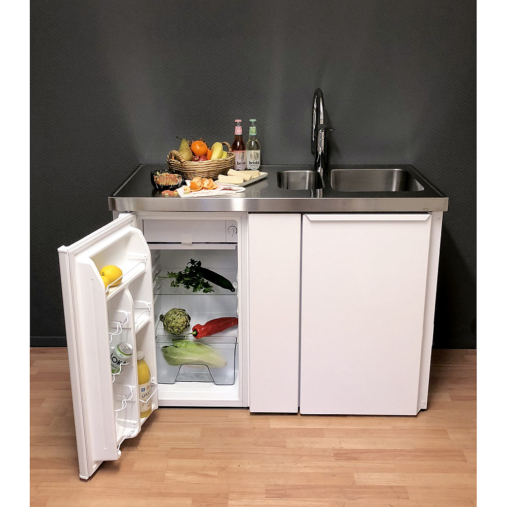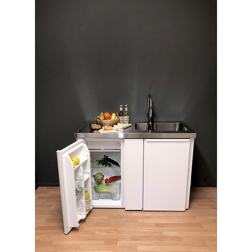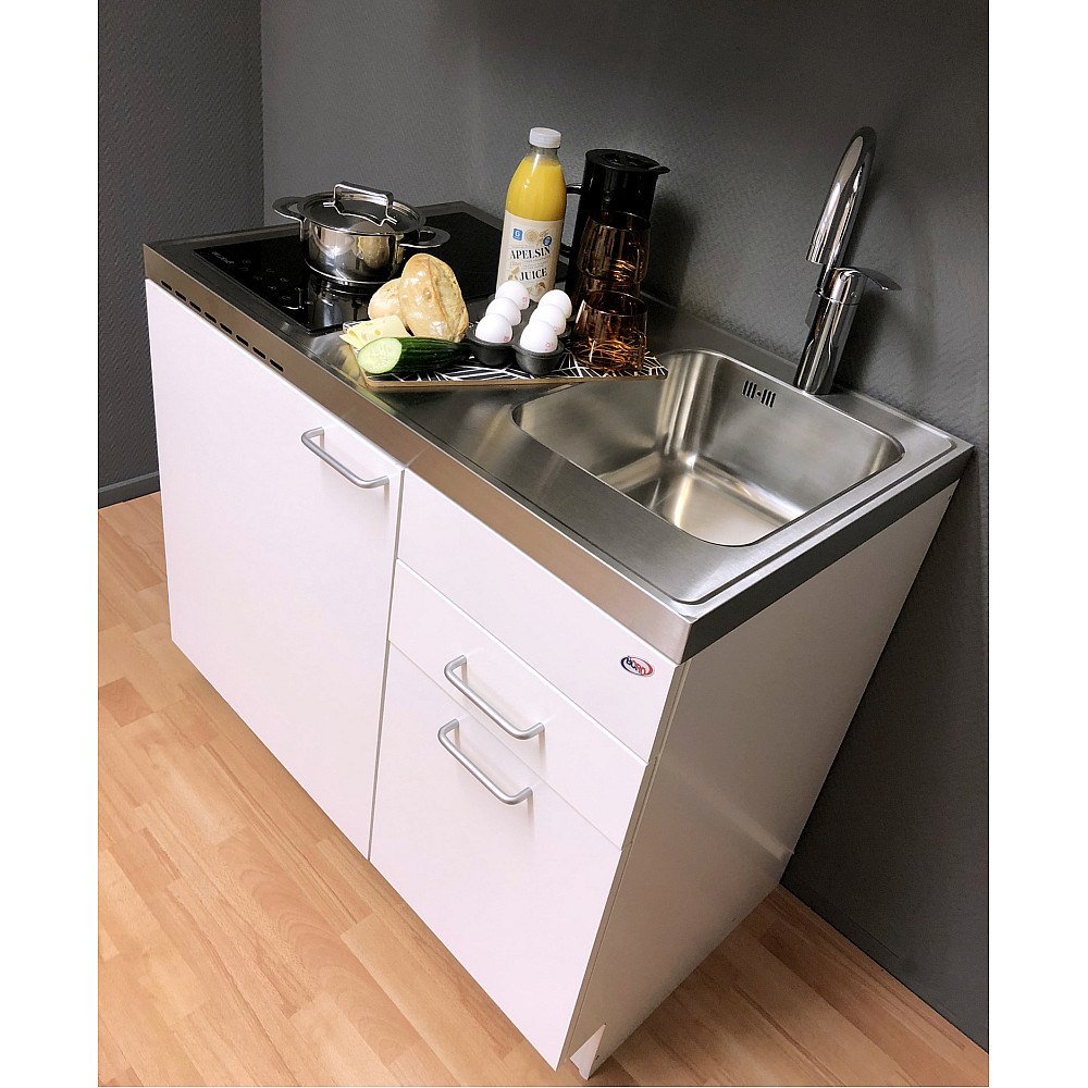Den rostfria diskbänken är utrustad med en diskho och finns i både höger- och vänsterutförande beroende på rummets utformning. Det integrerade kylskåpet har ett praktiskt köldfack för enklare frysbehov. Den moderna touchstyrda hällen har två effektiva värmezoner (1200 W + 1800 W), strömindikator i 9 steg, samt timerfunktion från 1 till 99 minuter.