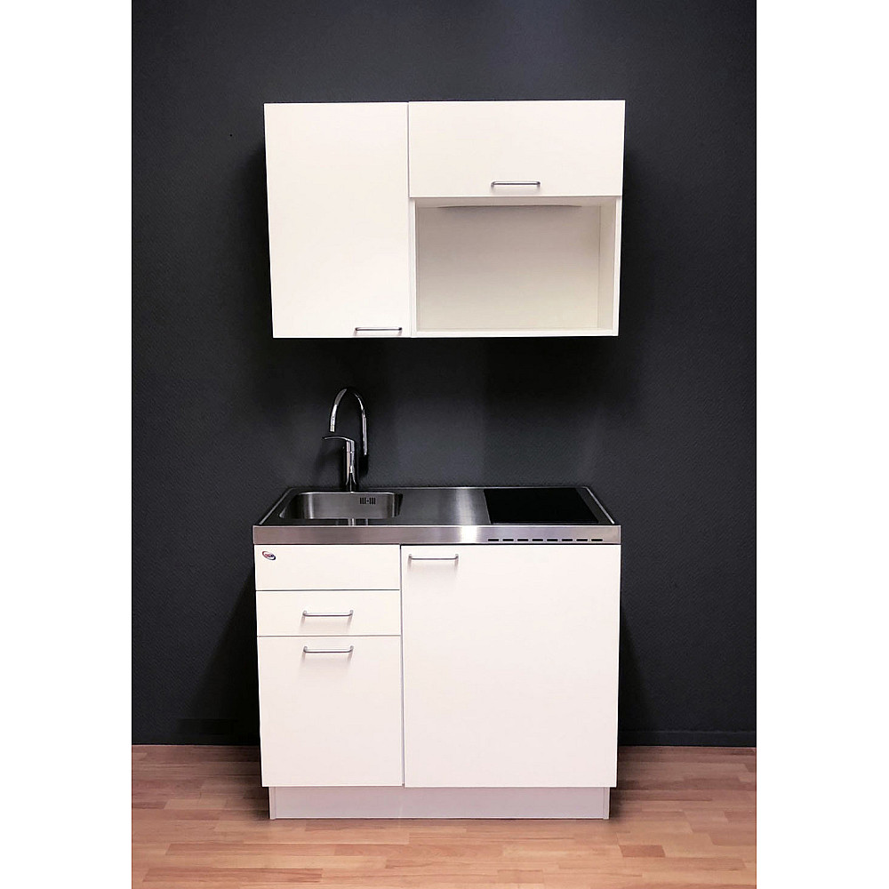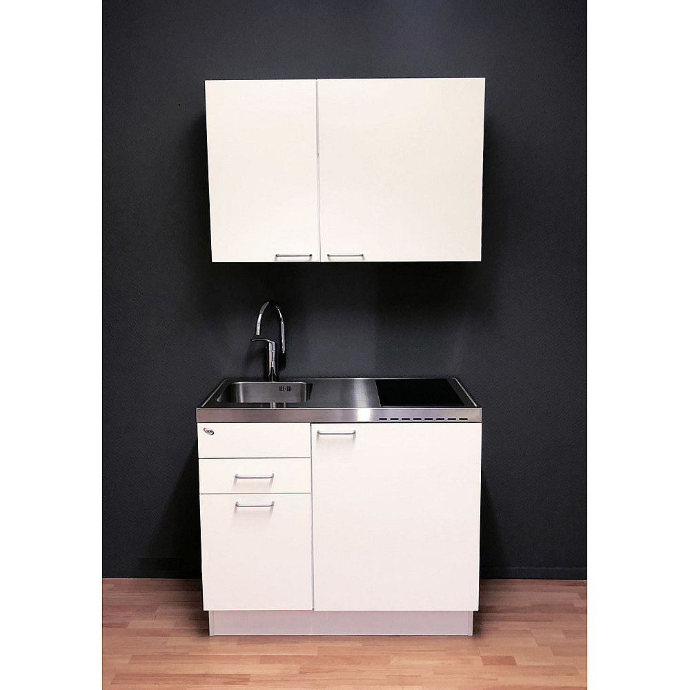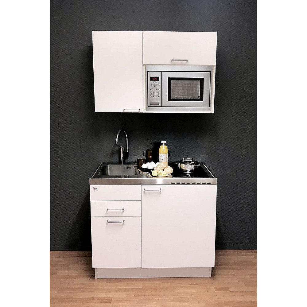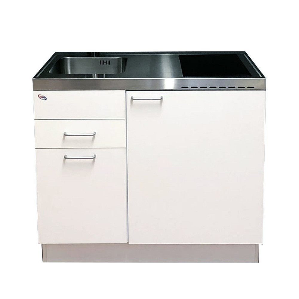 Den rostfria diskbänken är utrustad med en diskho och finns i både höger- och vänsterutförande beroende på rummets utformning. Det integrerade kylskåpet har ett praktiskt köldfack för enklare frysbehov. Den moderna touchstyrda hällen har två effektiva värmezoner (1200 W + 1800 W), strömindikator i 9 steg, samt timerfunktion från 1 till 99 minuter.