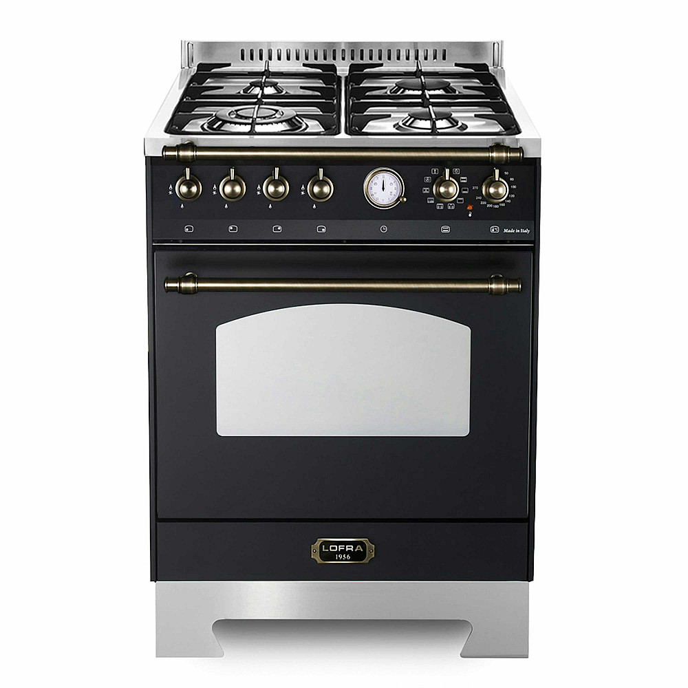 Egenskaper. Lofra Dolce Vita gasspis 60 cm i svart med bronsdetaljer har 4 gasbrännare med elektrisk gaständare och max temperatur 270 grader. Brännareffekt vänster fram 2,20 kW vänster bak 2,05 kW höger bak 1,30 kW och höger fram 0,75 kW. 1 multifunktionsugn med volym 70 liter och maxeffekt 2,5 kW. Utrustad med 2 teleskopskenor 2 gallerhyllor och 1 plåt. Ugnsfunktioner inkluderar belysning undervärme övervärme under och övervärme varmluft och upptining. Levereras med wok support pizzasten rotisseri härdat glas och uttagbart glas samt analog timer. Spisen levereras utan sockel.