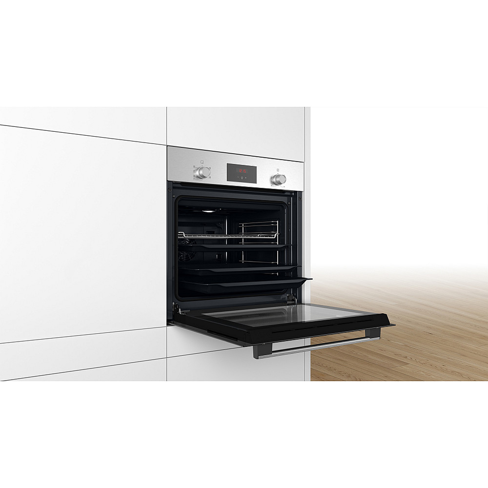Jämn värmefördelning för pålitliga resultat Bosch HBF113BR1S är en inbyggnadsugn som använder 3D HotAir för att sprida värmen jämnt i hela ugnsutrymmet. Det gör att du kan baka och laga mat på upp till tre nivåer samtidigt med ett jämnt resultat. Funktionen passar särskilt bra för dig som vill kunna laga flera saker samtidigt utan att kompromissa med kvaliteten.