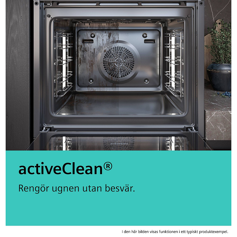 activeClean är ett pyrolytiskt rengöringssystem där ugnen värms upp till mycket höga temperaturer. Fett och inbrända matrester omvandlas till fin aska som enkelt torkas bort efter avslutad rengöringscykel. Metoden eliminerar behovet av manuella rengöringsmedel och förenklar underhållet av ugnsutrymmet.