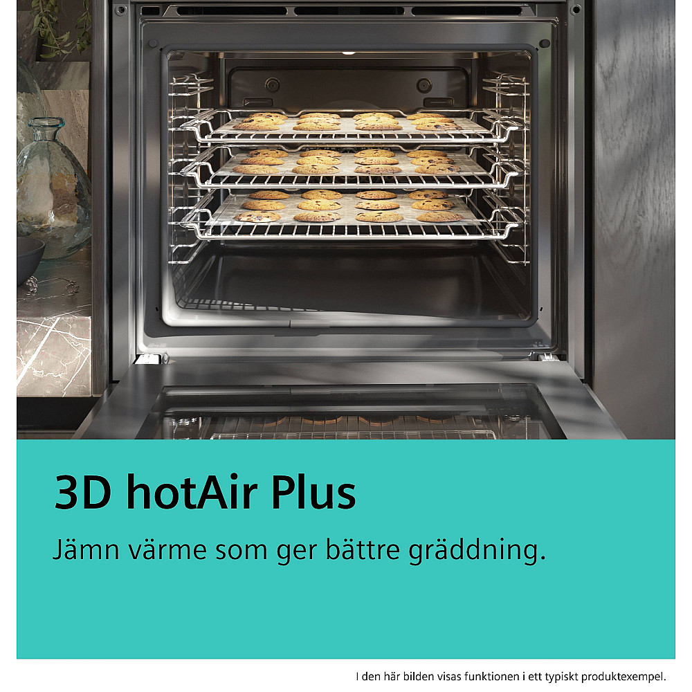3D hotAir Plus säkerställer att värmen cirkulerar jämnt i hela ugnsutrymmet. Detta gör det möjligt att tillaga flera rätter samtidigt på upp till tre nivåer utan att smaköverföring eller ojämn gräddning uppstår.
