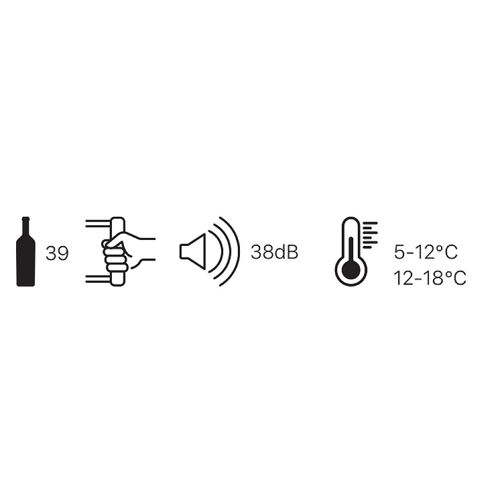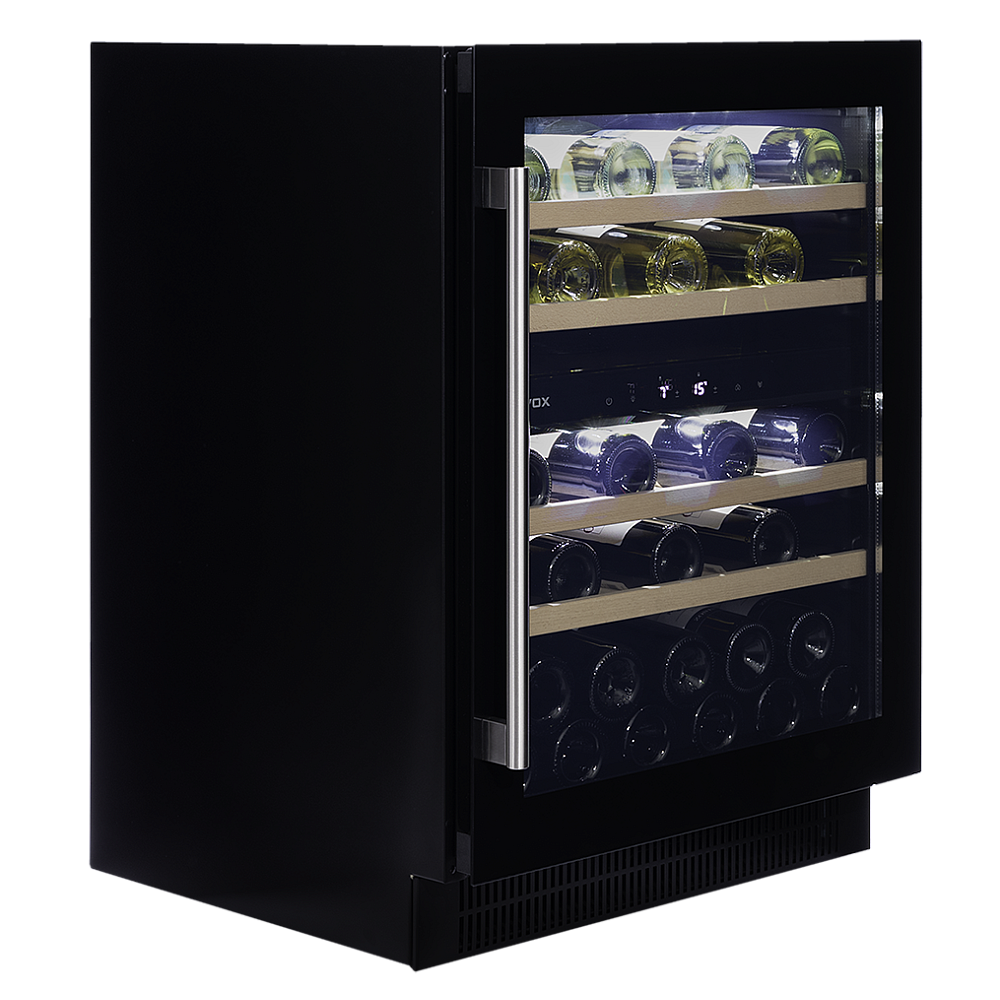 Elegant design och modern teknik. Den UV-skyddade glasdörren kombineras med rostfritt handtag och trähyllor med räcken för säker och stilren förvaring. Invändigt belyses flaskorna av multifärgad LED-belysning i vitt blått eller amber. Temperaturen styrs via LED-touchskärm och den fläktassisterade kompressortekniken tillsammans med frontventilation möjliggör smidig integrering under köksbänk.