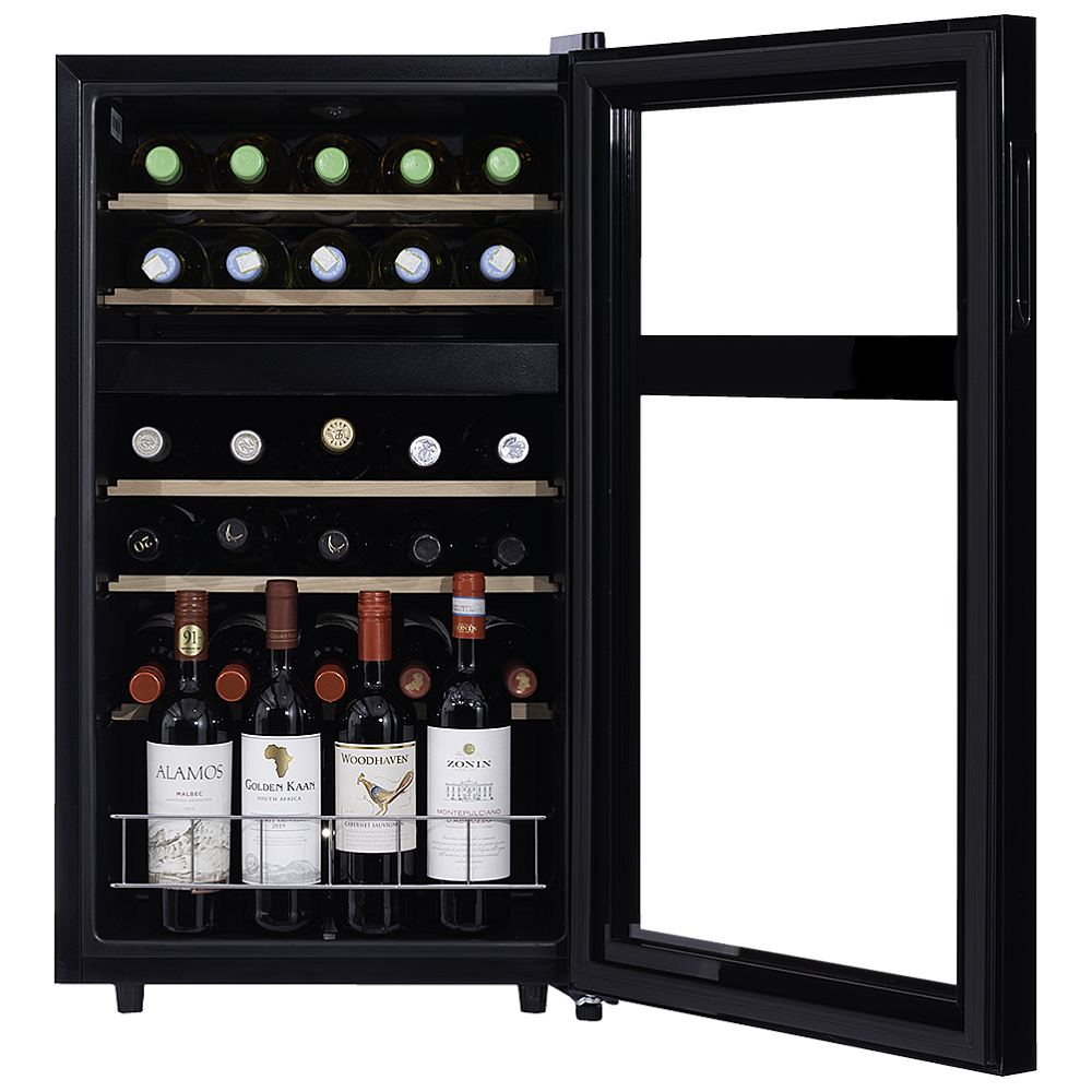 Genomtänkt design och stabil drift. Skåpet har en infälld dörröppning för ett rent uttryck och är utrustat med LED-touchskärm för enkel temperaturstyrning. Flaskorna placeras på träbeklädda hyllor som även möjliggör förvaring av öppnade flaskor i stående position. Blå LED-belysning skapar ett elegant intryck, medan fläktassisterad kompressorkylning säkerställer jämn temperatur. Modellen är endast avsedd för fristående placering och ska inte byggas in.