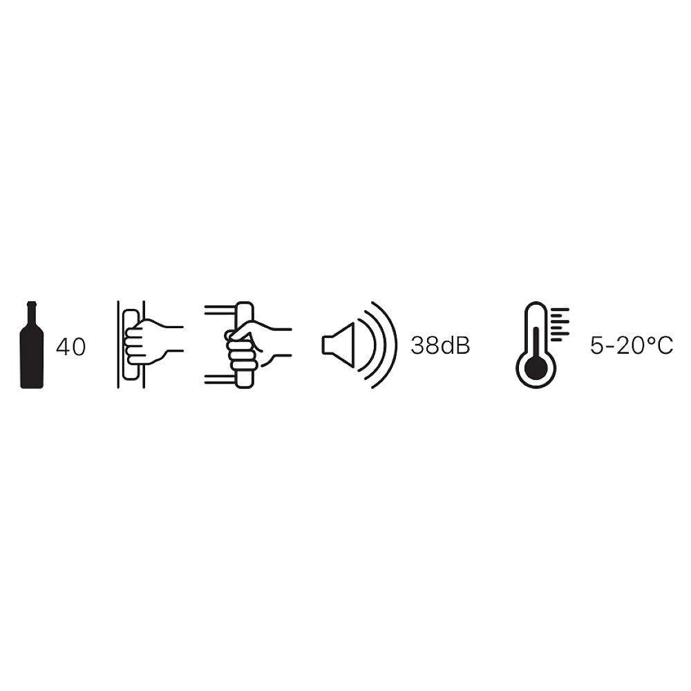 Specifikationer. Installationssätt inbyggnad kapacitet upp till 40 flaskor temperaturzoner en zon hyllor teleskopiska metallhyllor med flaskdisplay belysning LED vitt blått amber dörr rostfri med UV-skyddat glas styrning LED touch display kyltyp vinkyl med låg vibration och låg ljudnivå avsedd för inbyggnad.