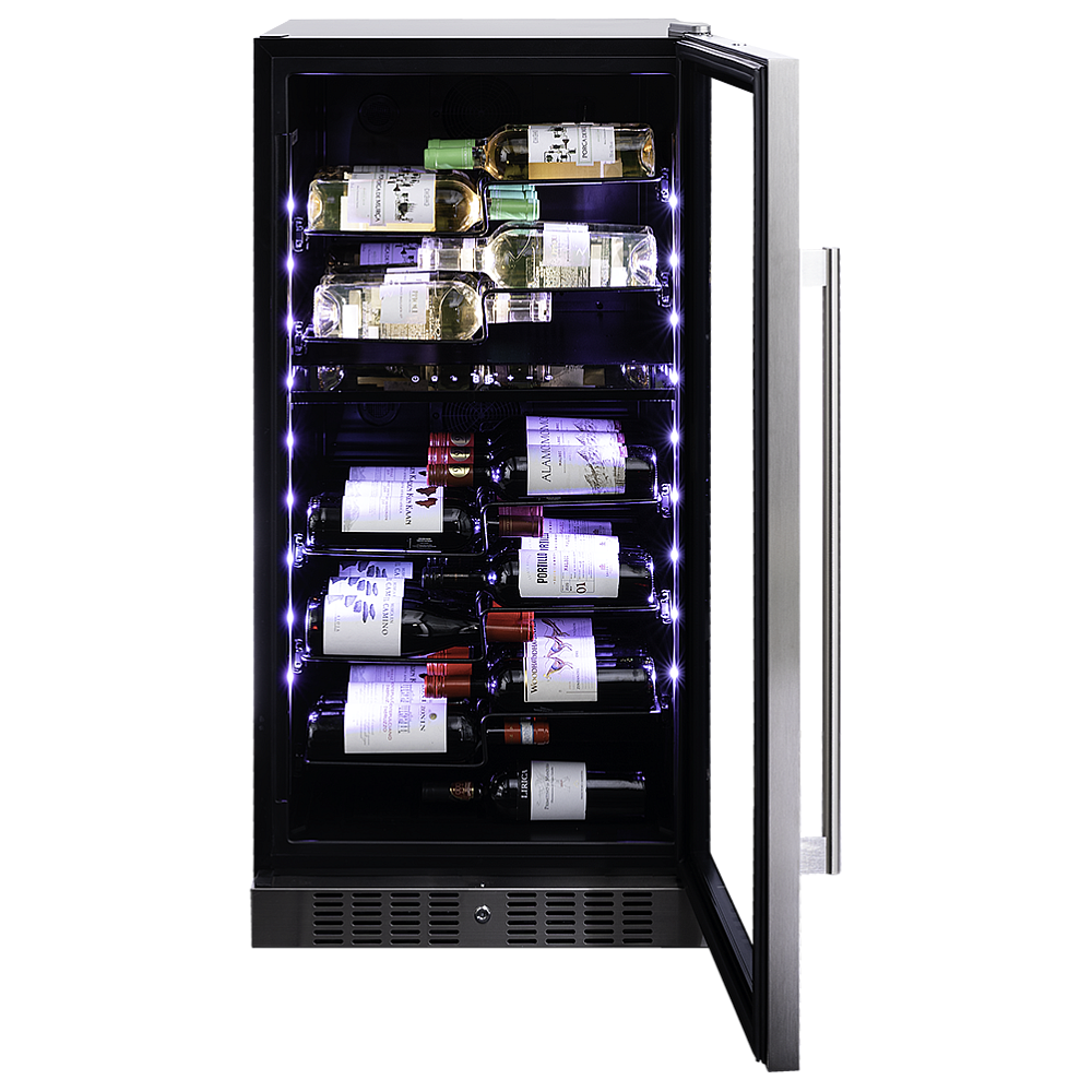Elegant presentation och flexibel installation. Flaskorna placeras på patenterade displayhyllor i metall och belyses av LED-ljus i vitt blått och amber från två håll för maximal visuell effekt. Den rostfria dörren med UV-skyddat glas kan öppnas med dold eller rostfri handtagslösning. Skåpet styrs via LED-touchpanel och kan användas både fristående eller byggas in under bänk.