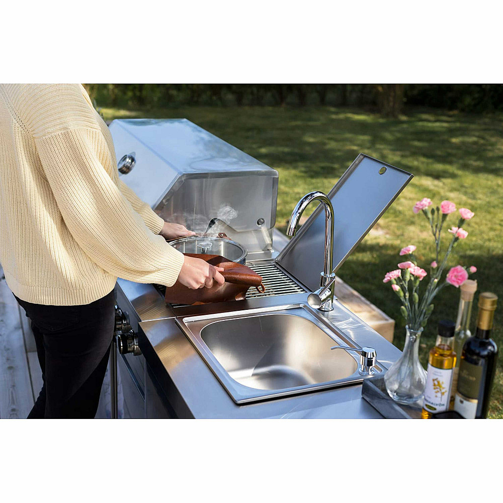 Extra arbetsyta med skärbräda och smarta detaljer. Den medföljande skärbrädan i trä kan placeras ovanför diskhon och ger extra avlastningsyta när du förbereder maten. Diskbänken är även utrustad med tvålpump och har en arbetsyta till höger om kranen, vilket gör den ännu mer funktionell vid matlagning utomhus.