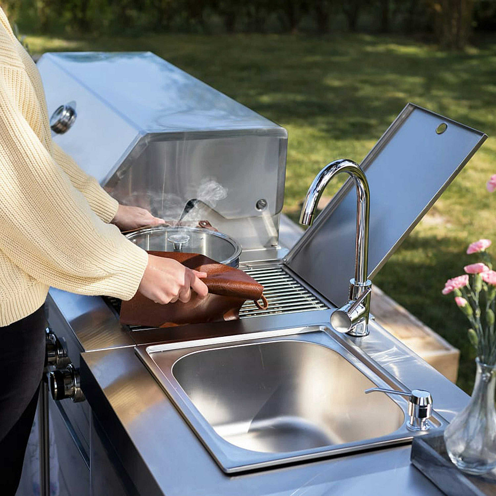 Rostfritt stål 304 SS i exklusiv och tålig design. Modulen är tillverkad i rostfritt stål 304 SS och har en stilren och robust konstruktion som är anpassad för utomhusbruk. De kromade reglagen och den rostfria fettuppsamlingsskålen i fronten bidrar till både hållbarhet och enkel rengöring, samtidigt som de förstärker det exklusiva intrycket i ditt utekök.