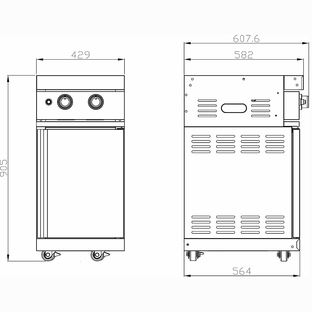 Fristående modul med hjul och förvaringsskåp. Tack vare fyra stabila hjul kan sidobrännarmodulen enkelt flyttas efter behov, och två av hjulen är utrustade med broms för säker och stabil placering. Det praktiska förvaringsskåpet ger plats för gasolflaska och grillredskap, vilket gör modulen både funktionell och platsbesparande. Produkten är CE certifierad och omfattas av upp till 10 års garanti på utvalda delar inom Stainless Collection.