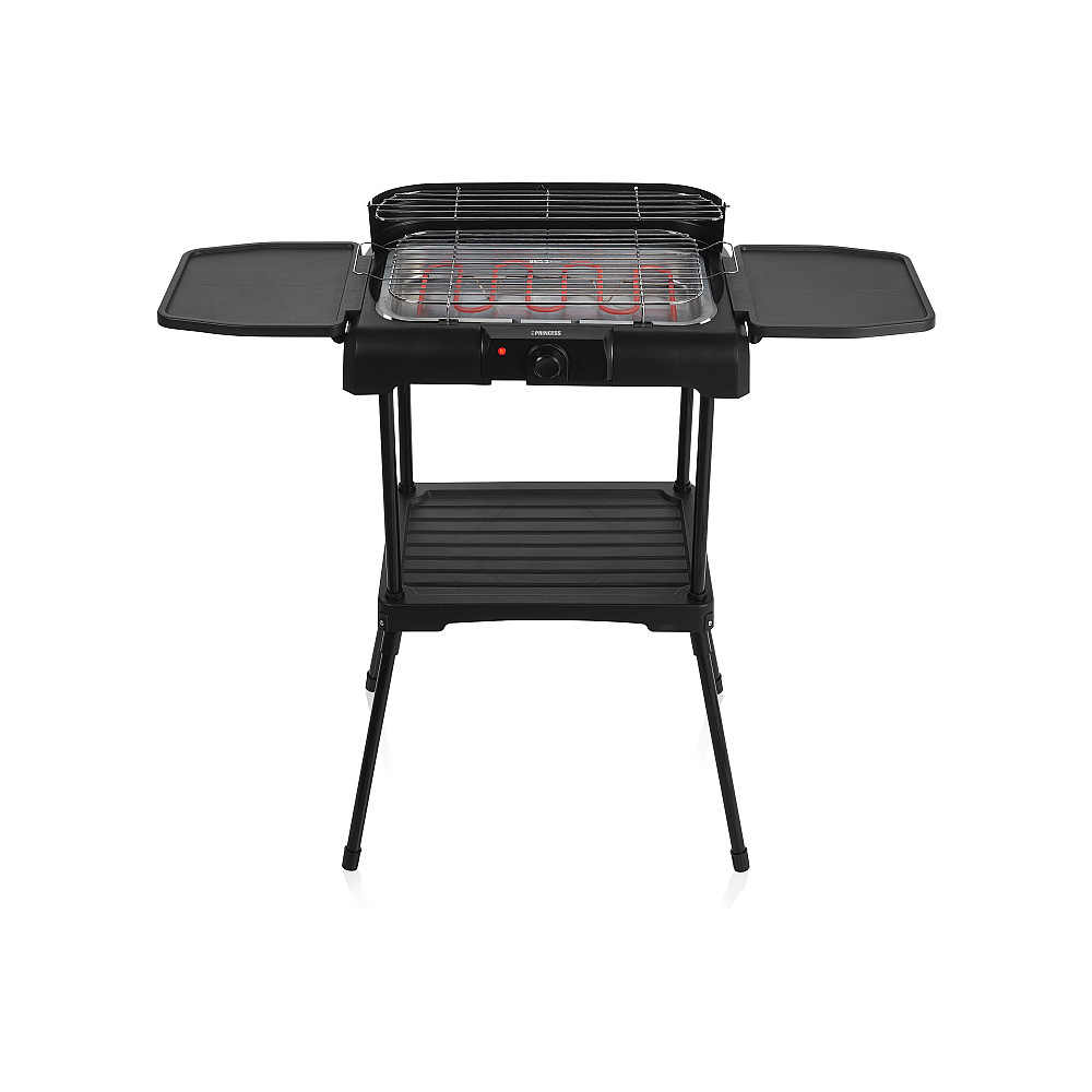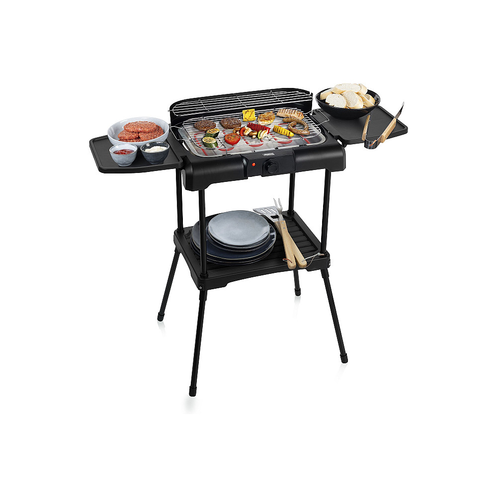 Med det medföljande stativet får du två användningsmöjligheter i samma grill eftersom den kan användas som bordsmodell eller fristående grill. Hyllan på stativet ger utrymme för redskap och ingredienser.