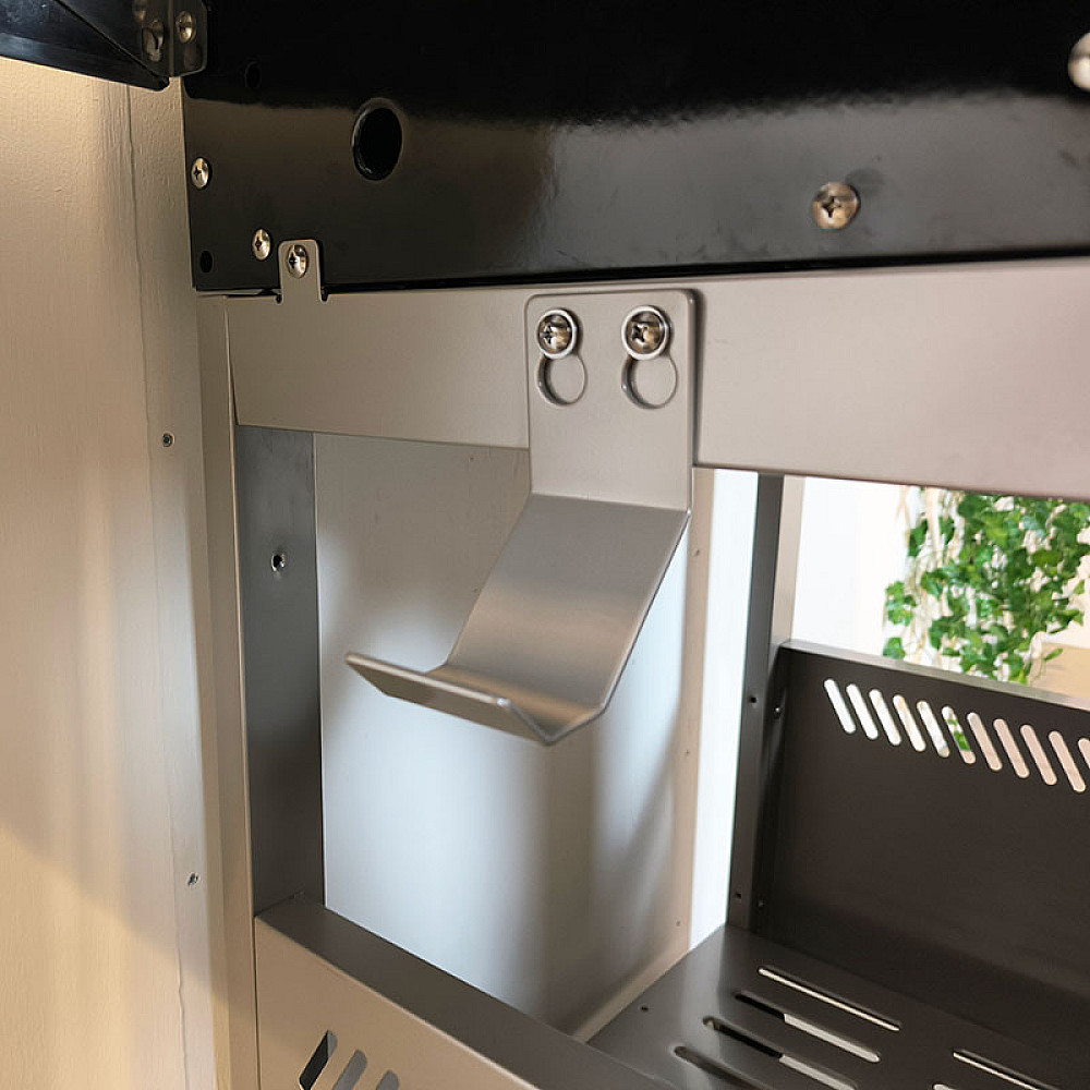 Grillen har två sidobord som ger gott om arbetsyta och ett rymligt skåp för gasolflaska och tillbehör. De fyra hjulen gör grillen enkel att flytta vid behov.