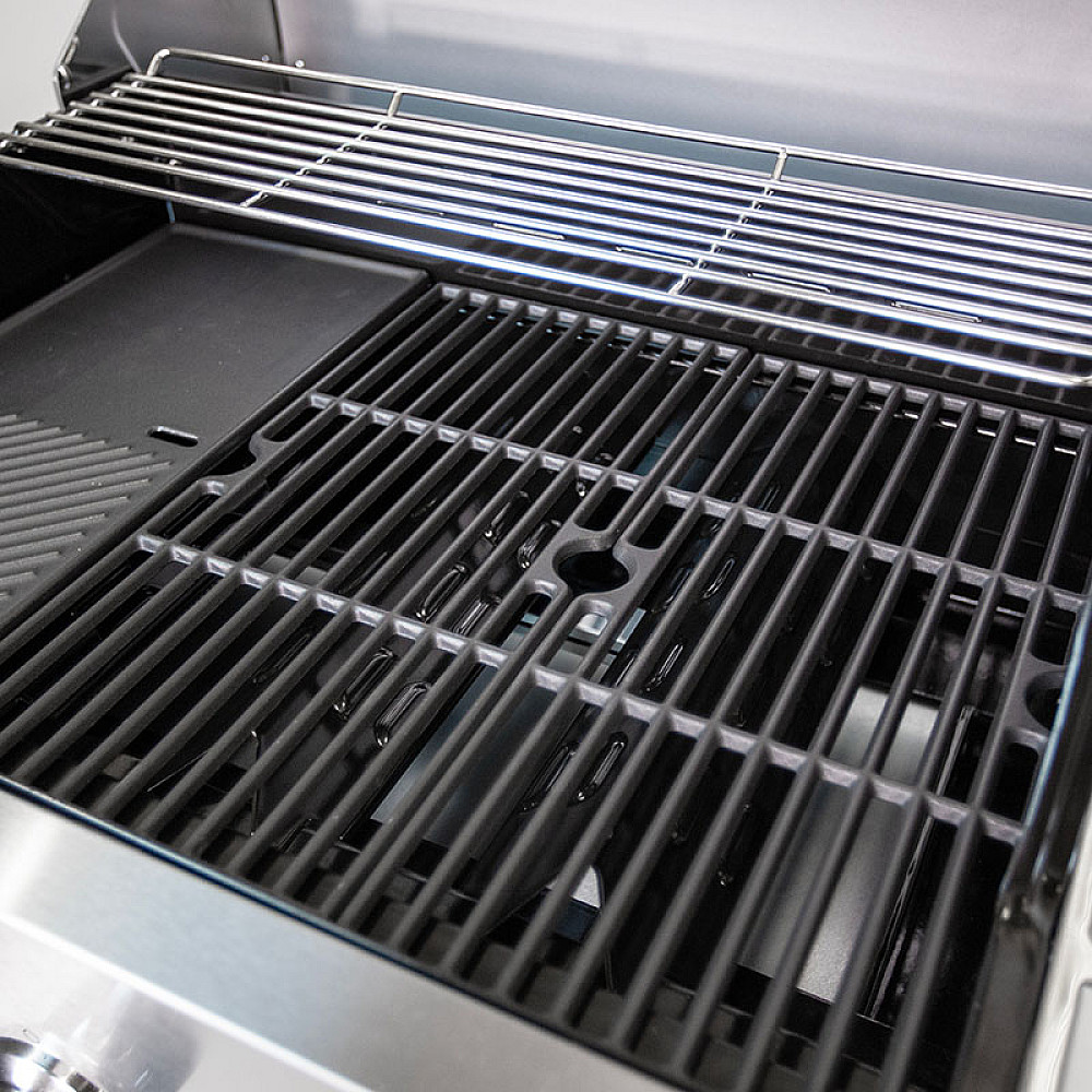 De tåliga gjutjärnsgallren och den integrerade stekplattan ger god värmehållning och öppnar upp för många tillagningsmöjligheter. Värmehyllan håller maten varm tills det är dags att servera.