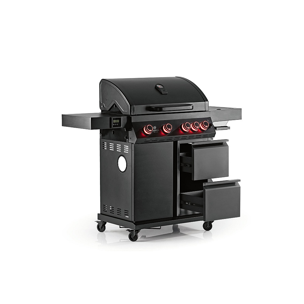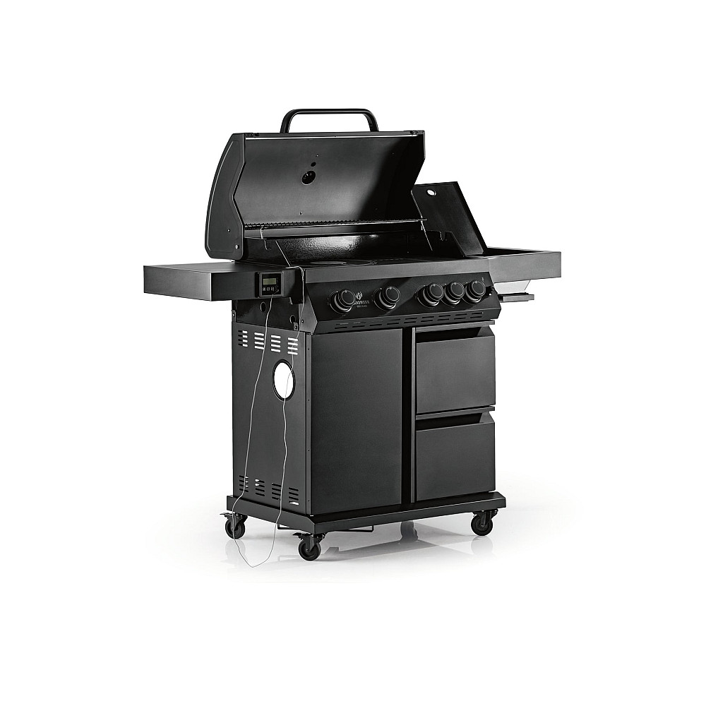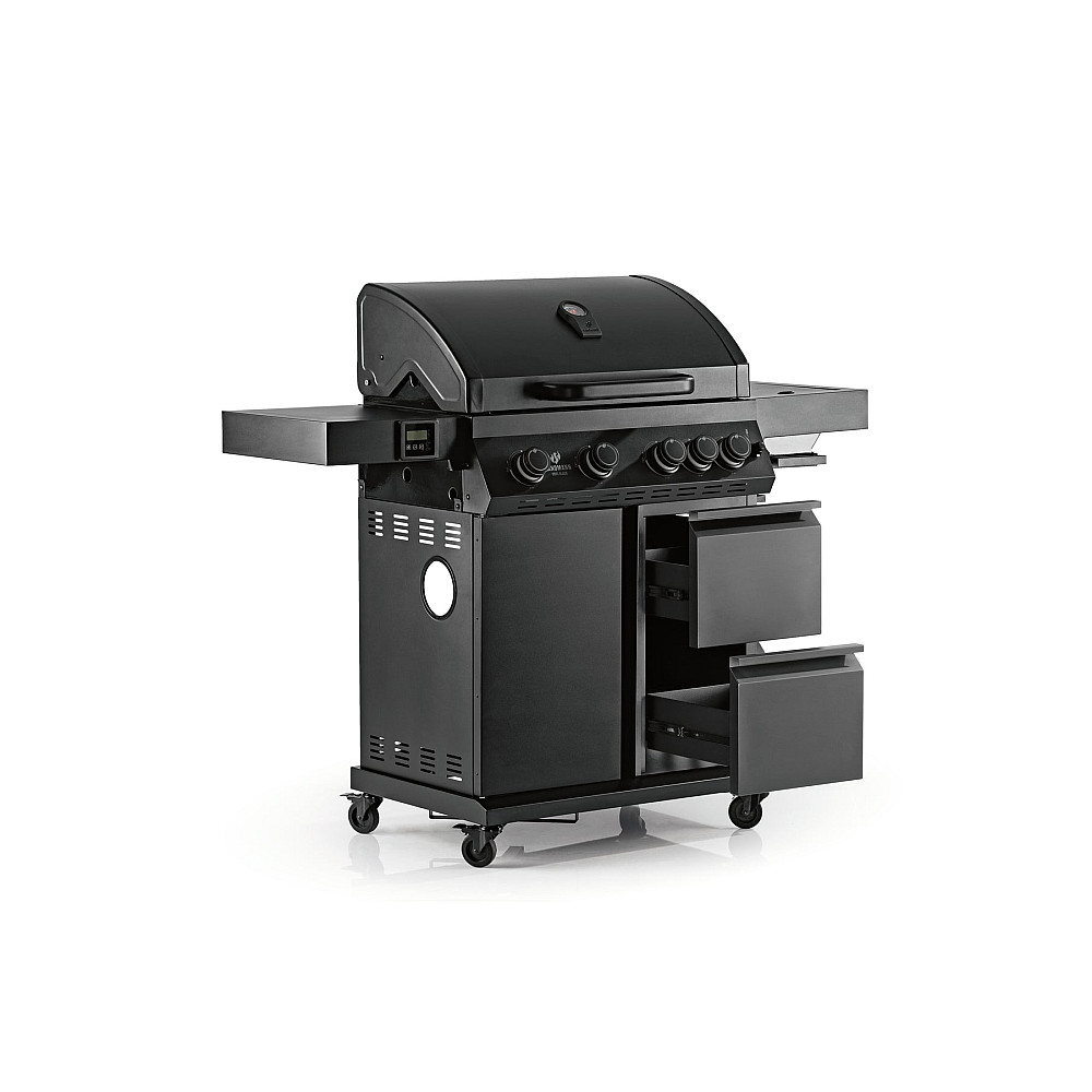Smart förvaring och praktiska innovationer. Cool Black MaxX 4.1 är utrustad med utdragbara lådor som ger smidig förvaring av redskap och tillbehör. En av lådorna innehåller en inbyggd kylbox som håller drycker och ingredienser kylda under grillningen. Den inbyggda instickstermometern gör det enkelt att övervaka innertemperaturen för exakt tillagning.