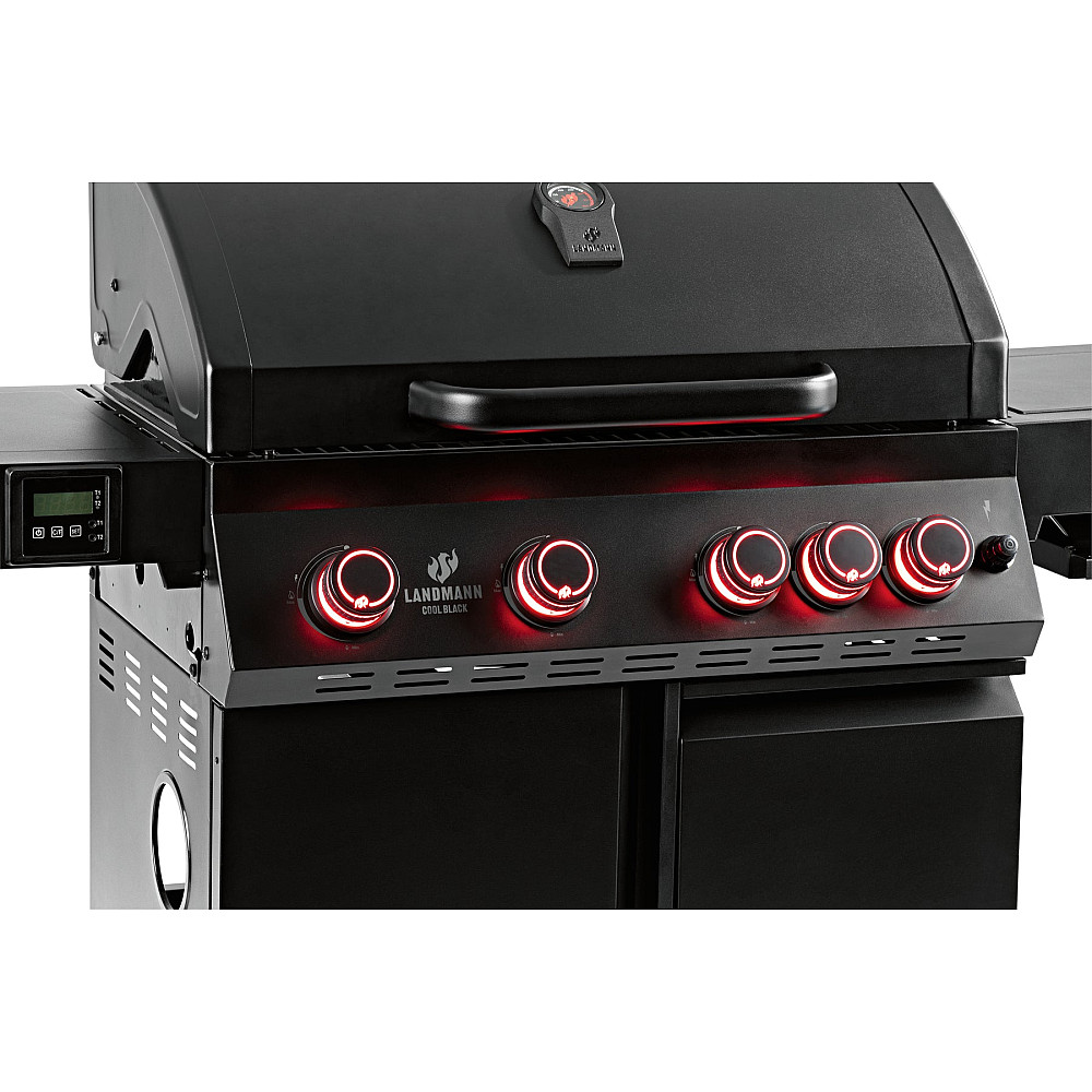 Specifikationer i korthet. Landmann Cool Black 4.1 MaxX har fyra justerbara brännare i rostfritt stål (4 x 3,65 kW), infraröd sidobrännare i MaxX-zon upp till 800 °C (4,0 kW), PTS-system, Modulus grillgaller i kraftigt gjutjärn med grillyta 76 x 41 cm, varmhållningsgaller 67 x 19 cm, utdragbara förvaringslådor med inbyggd kylbox, instickstermometer, LED-belysta vred, emaljerade värmefördelningsplåtar samt dubbelisolerat lock. Mått 53,5 x 144,5 x 121 cm, vikt 55,5 kg.