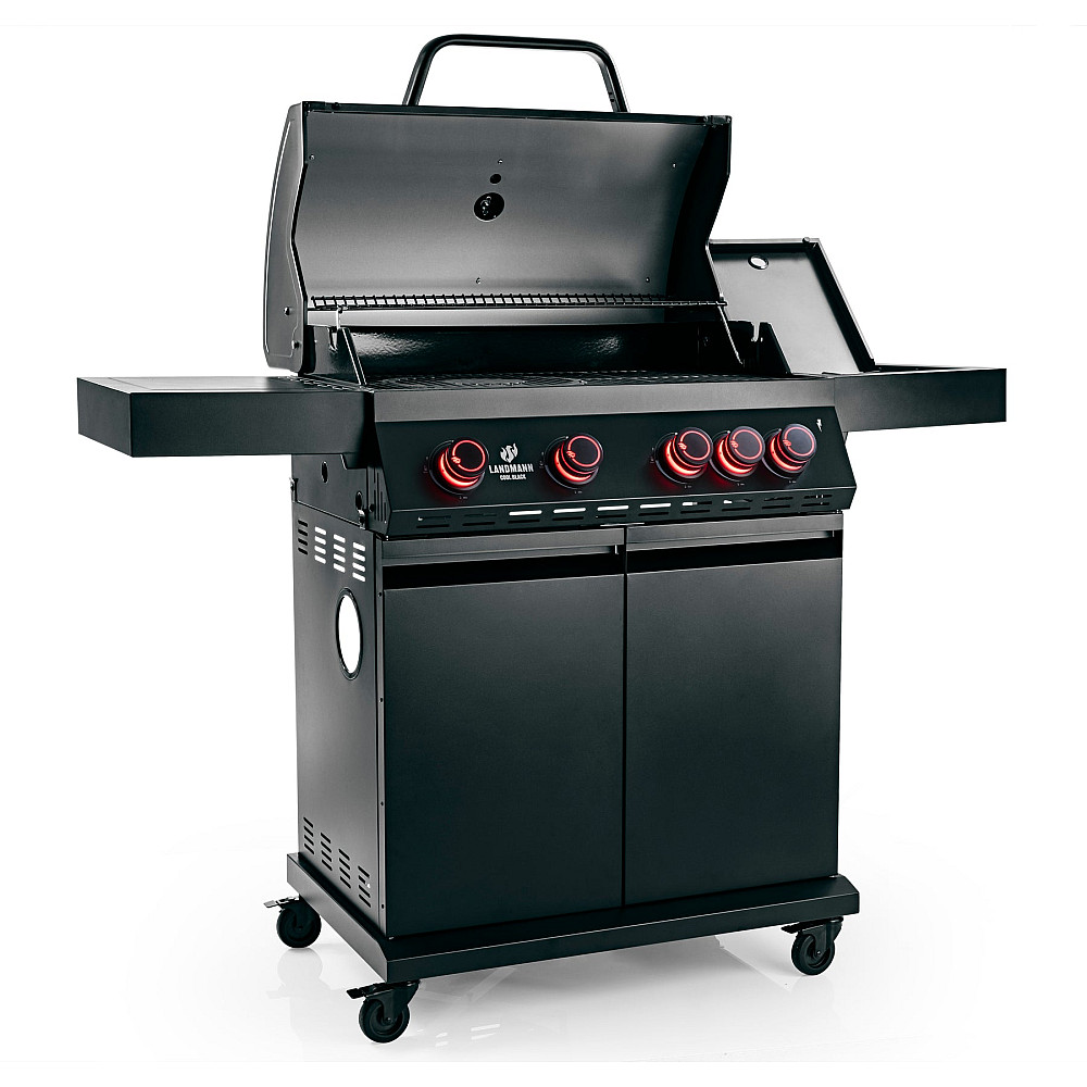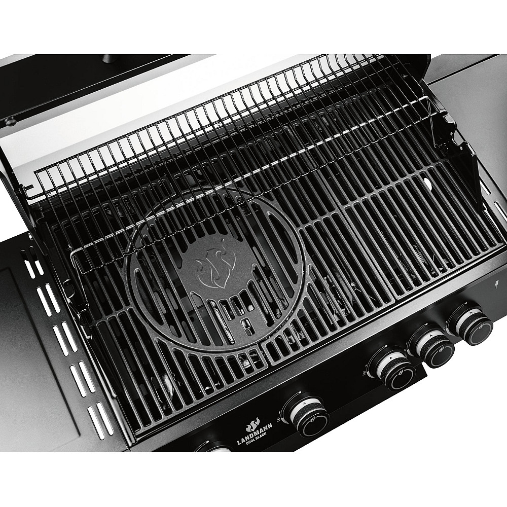 Specifikationer i korthet. Landmann Cool Black Classic 4.1 har fyra justerbara brännare i rostfritt stål (4 x 3,65 kW), PTS-system, sidokokplatta, Modulus grillgaller i kraftigt gjutjärn med grillyta 76 x 41 cm och utbytbar mittsektion, varmhållningsgaller 67 x 19 cm, dubbla skåpsluckor, LED-belysta vred, emaljerade värmefördelningsplåtar samt dubbelisolerat lock. Mått 53,5 x 144,5 x 121 cm, vikt 55,5 kg.
