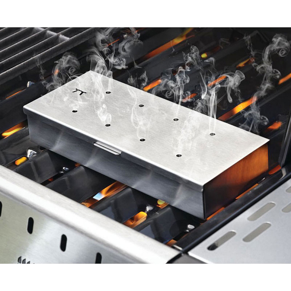 Specifikationer. Rökbox i rostfritt stål. Mått 23 x 9 x 4 cm längd x bredd x djup. Används med rökspån eller träflis för att ge maten en extra rökig smak.