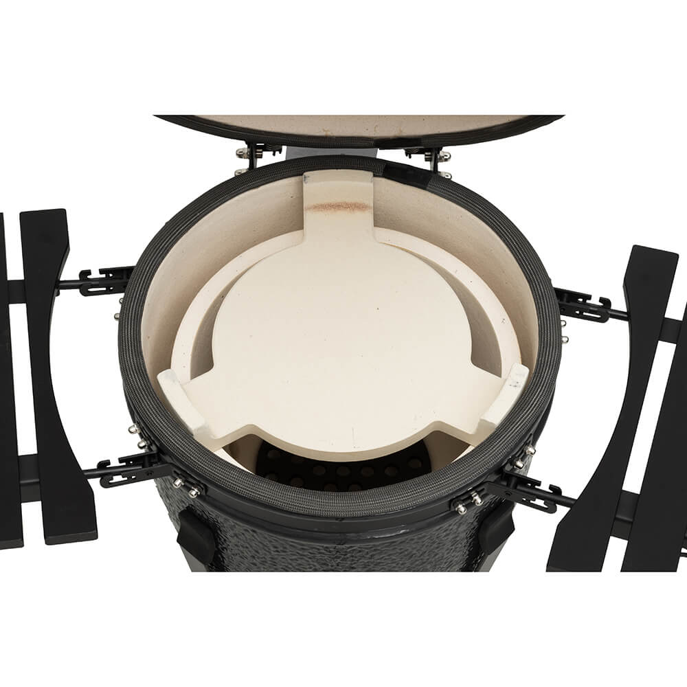 Kamadon står stadigt i en pulverlackerad vagn utrustad med två hjul och två låsbara hjul. De hopfällbara sidoborden i bambu erbjuder enkel extra arbetsyta när det behövs.